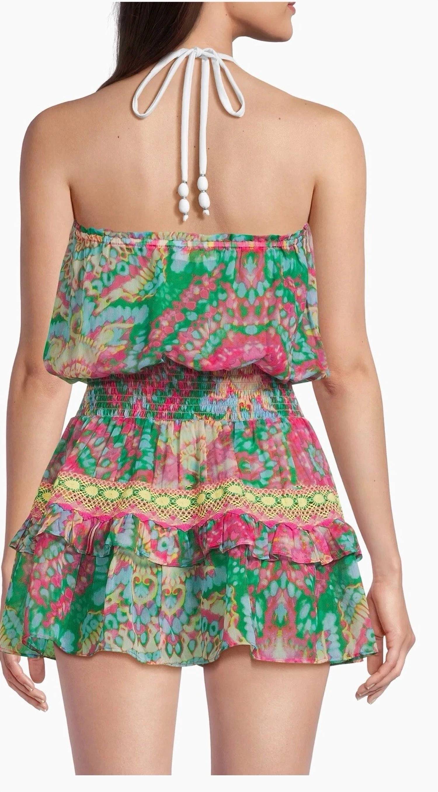 A short and breezy dress for those warmer days. Ramy Brook's Jaliyah Printed Strapless Minidress is a vibrant and stylish choice for sun-soaked vacations. Crafted from 100% polyester and featuring a flirty palm green multi medallion print, this mini dress boasts a flattering smocked waistband and an airy flounce skirt. Designed for summer , it offers effortless elegance with a fun tie closure. Easy to care for, machine wash and line dry to maintain its chic A-line silhouette.