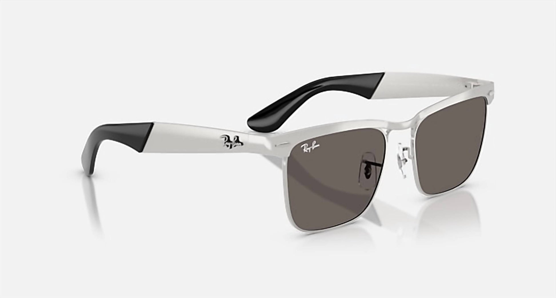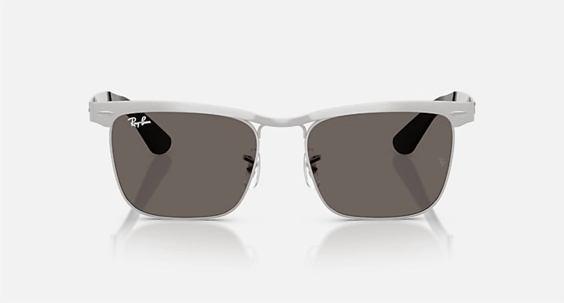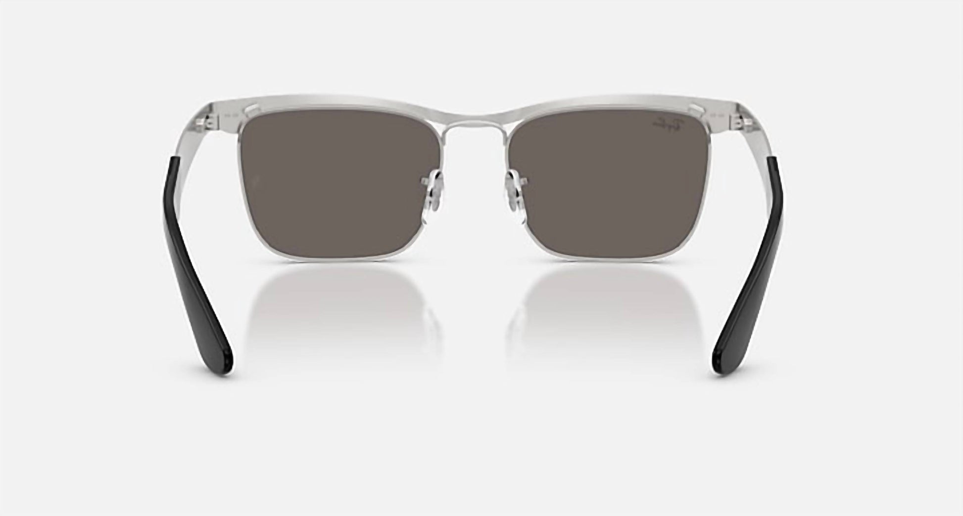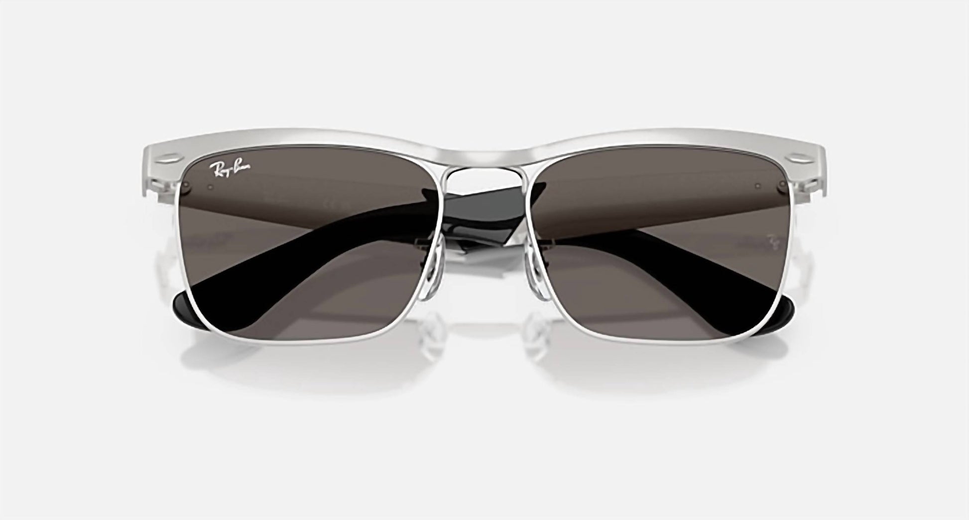 Introducing the Ray-Ban Men's Wayfarer Deluxe Sunglasses in a striking Matte Sandblasted Silver On Silver. These sunglasses feature a modern square frame shape crafted from high-quality metal with dark grey solid color lenses. Dimensions include a lens height of 40.1mm, size 53 18mm, and a temple length of 145mm, featuring adjustable nose pads for a comfortable fit. Embrace the bold design with its distinctive half-metal, half-injected temples and stand out effortlessly. Model code RB3875 019.