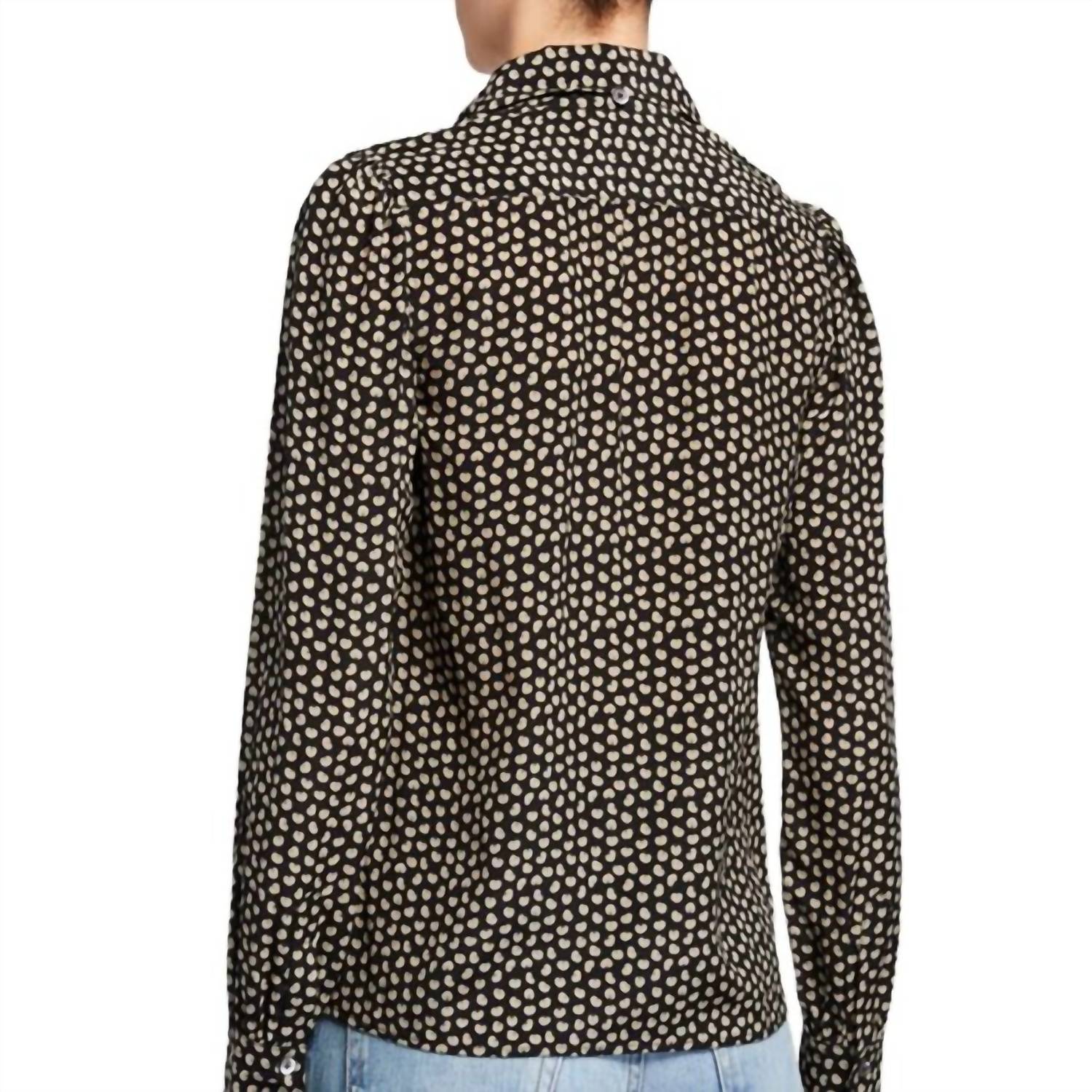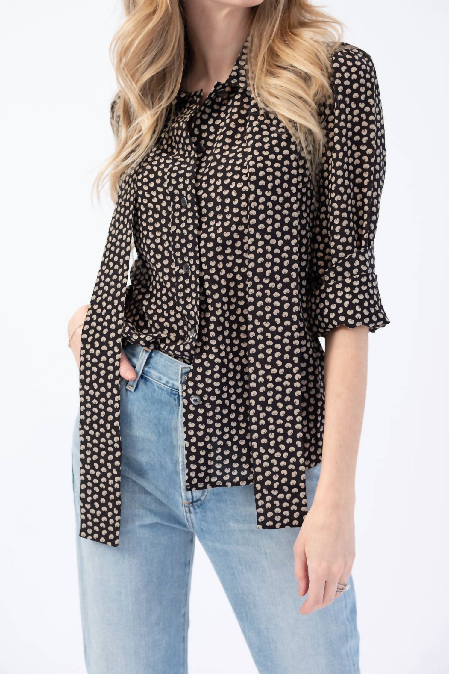 Elevate your wardrobe with the RE/DONE 70s Tie Blouse, a chic piece in a charming beige and black croissant print. This women's blouse boasts long sleeves and a classic collar, offering a nod to vintage style with its relaxed silhouette. Enhanced by self-removal front ties, a spread collar, and triple-button cuffs, it promises both comfort and sophistication. Made without pockets, it features a button closure and requires hand washing with line drying, making it a perfect choice for springtime workwear or special anniversary occasions.
