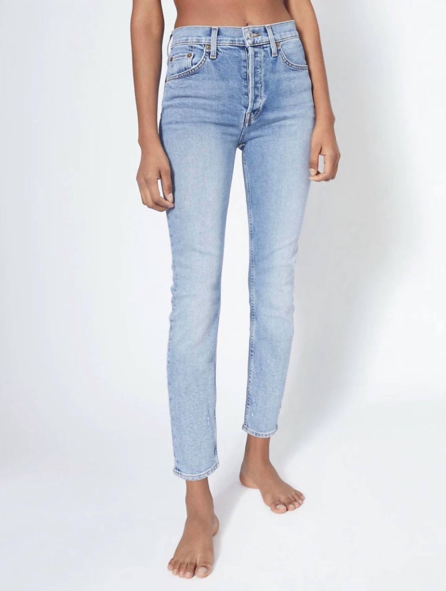 Tuck your favorite tee into these high-waist jeans for a more casual-cool feel. Elevate your spring wardrobe with the 90s High Rise Ankle Cropped Jeans by RE/DONE, designed for women who appreciate timeless style. These slim-fit jeans feature a high rise of 11 inches and a 27.5-inch inseam, perfect for showcasing your favorite footwear. Crafted from a medium stretch cotton blend (96% Cotton, 3% Polyester, 1% Elastane), they offer comfort and a flattering skinny leg silhouette. Finished in a light wash reminiscent of the mid-90s, these jeans boast a classic button closure and seamlessly placed back pockets. Care instructions include machine wash cold, tumble dry low, and warm iron if needed.