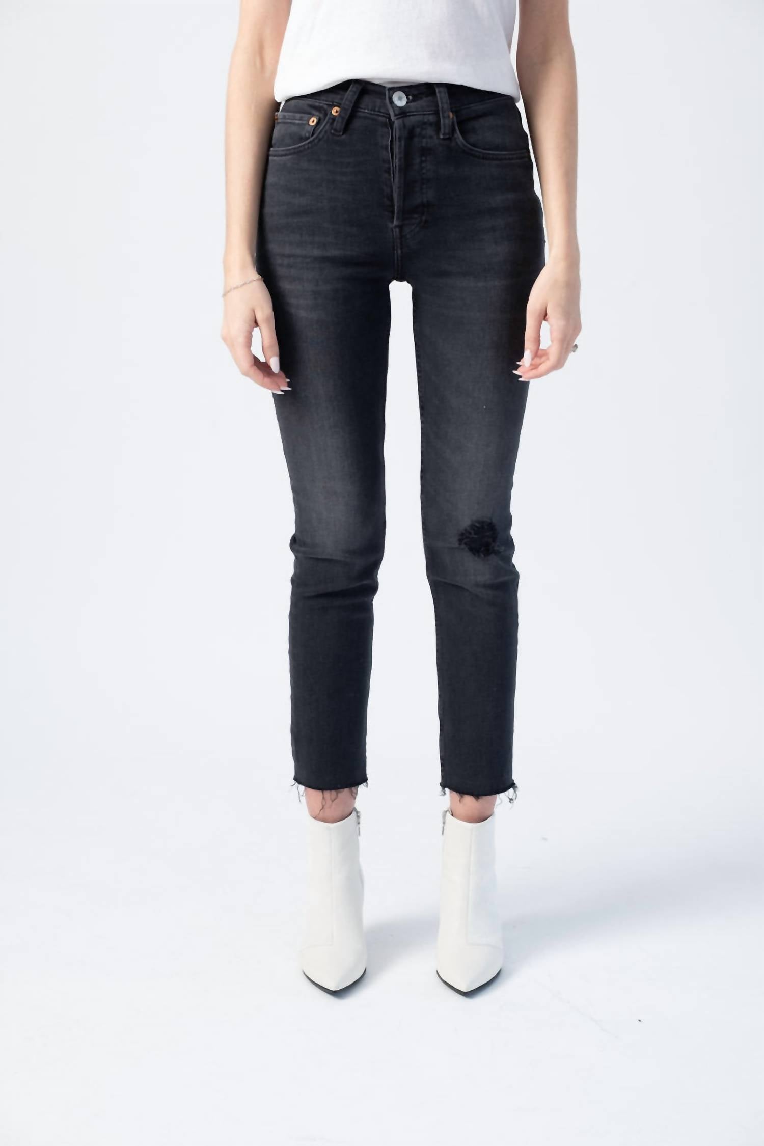 Tuck your favorite tee into these high-waist jeans for a more casual-cool feel. Elevate your streetwear collection with the RE/DONE Power Stretch High Rise Ankle Crop Jeans in Lived-In Black. These skinny jeans offer a high-rise fit in ultra-stretch denim, delivering both comfort and style. Designed with a cropped length, light distressing, and frayed hems, they exude a classic yet edgy vibe. Crafted in a solid dark wash, these jeans feature a zip closure and practical pockets, perfect for any occasion from travel to Thanksgiving gatherings. Care: Machine wash and tumble dry.