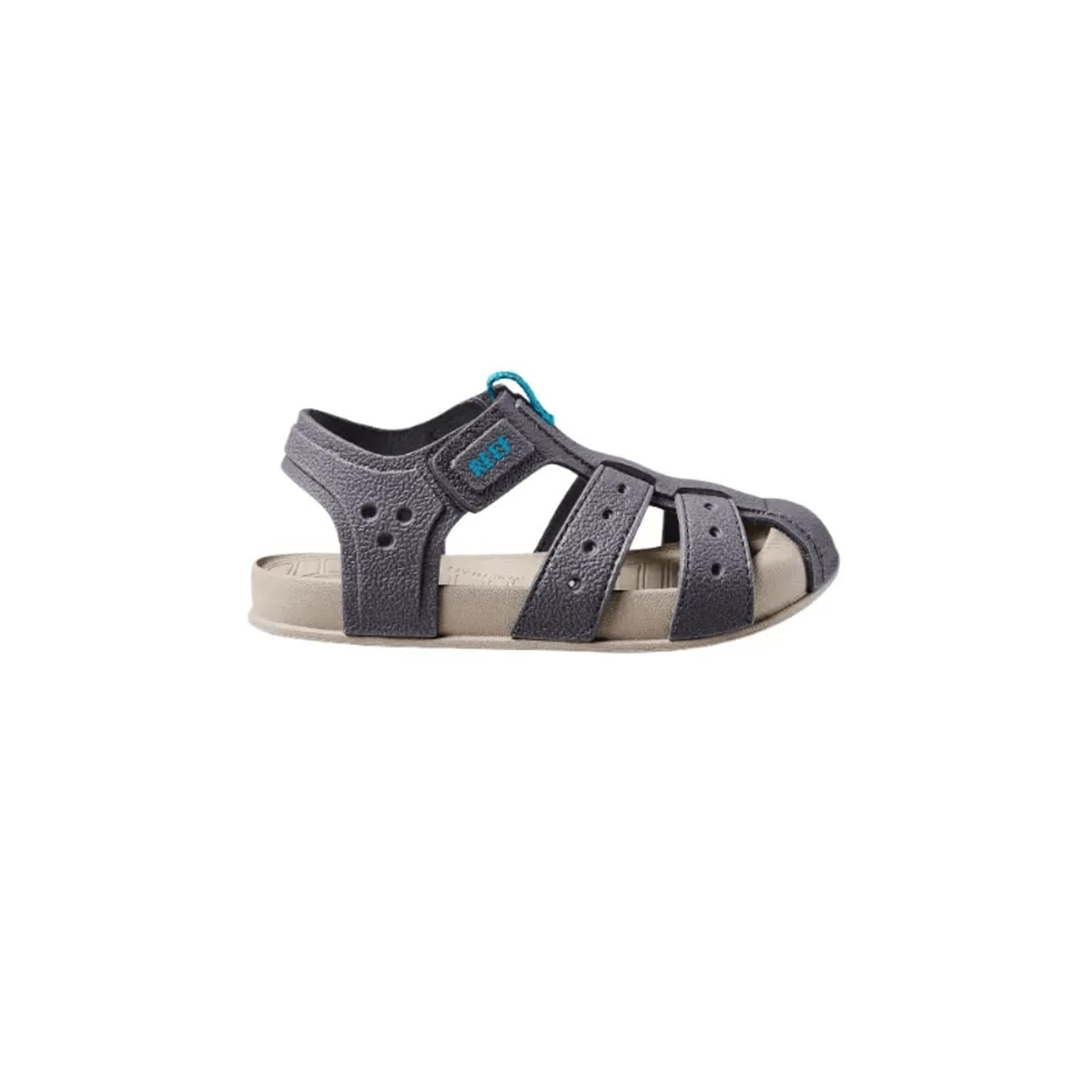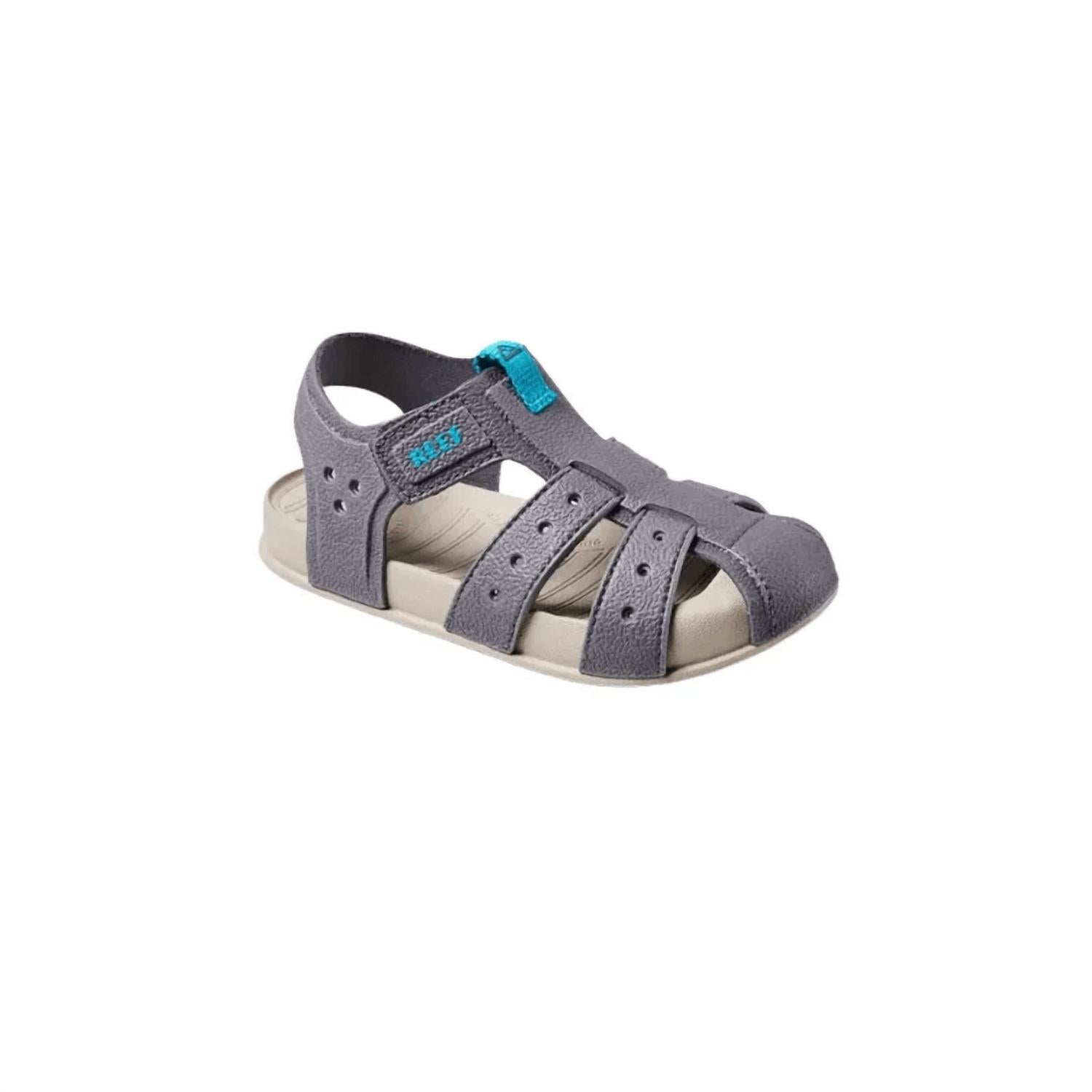 Introducing the Boy's Water Beachy Sandals by REEF, designed for toddlers who love summer adventures. These sandals feature a flat heel and an open toe shape, making them ideal for vacation fun. The double Velcro strap offers easy on and off, while ensuring stability as your little one explores. Perfect for a minimalist look in Oak Grey/Aqua, these summer sandals are beach-friendly and protective.