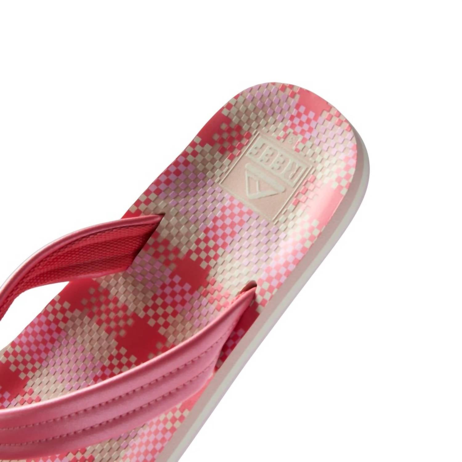 Introducing the Kid's Ahi Sandals by REEF in playful Pink Plaid, perfect for those sunny days. The sandals feature a water-friendly design with a synthetic strap and a comfortable printed EVA footbed. Enjoy added durability with a high-density EVA outsole, and the eco-friendly 100% recycled PET webbing liner made from post-consumer plastic bottles. Ideal for little ones on the go, these sandals ensure comfort with a soft 3-point strap.