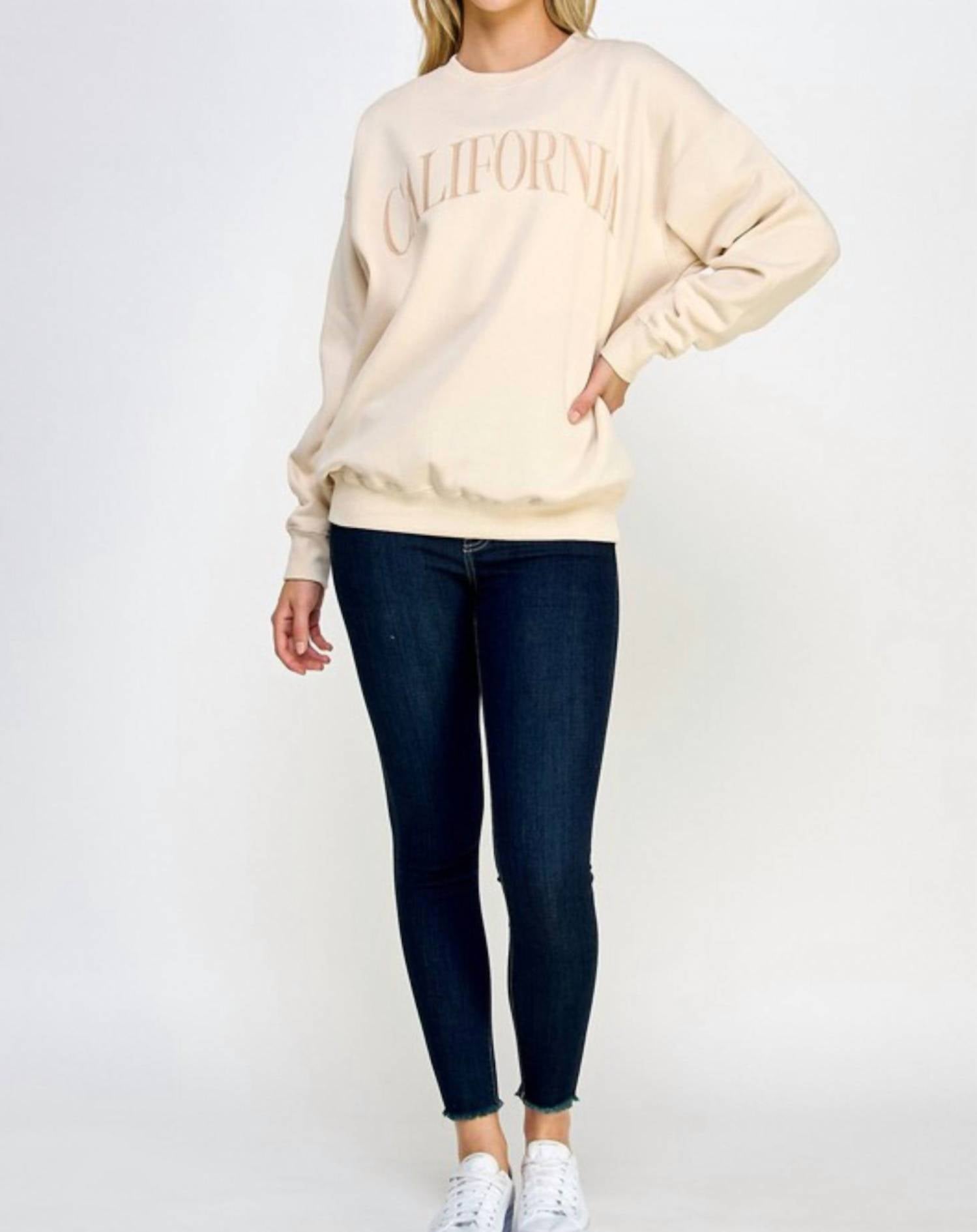 Whether you're running around town or lounging at home, this sweatshirt works for both. Embrace sporty aesthetics with the California Collegiate Style Sweatshirt by Reflex, crafted in a cozy cream hue. This sweatshirt features long sleeves and a graphic pattern, offering a relaxed fit that's perfect for fall outings. Enjoy the convenience of a pull-on closure and the versatility of activewear comfort. Please note, specific care instructions are not provided.