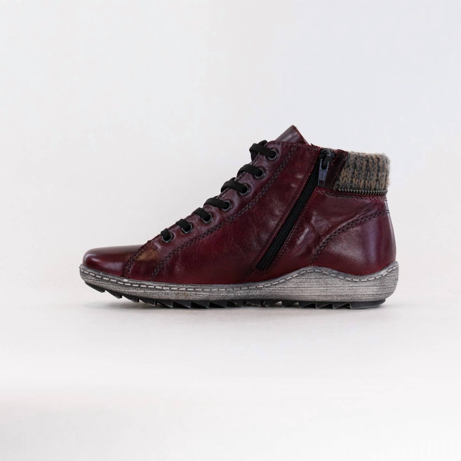 Say hello to the perfect, most versatile boot. The ankle height makes this style easily transition from day to night. Wear them with your favorite skinny jeans and tee for a more laid back look, or pair them with your favorite mini dress and jacket for a night out on the town. Step into fall with style and comfort in the Women's R1473 Lace Up Bootie by Remonte, a chic ankle bootie in a rich wine hue. Crafted from soft leather, these booties feature a flexible, durable sole and a cozy yarn cuff, perfect for all-day wear. The RemonteTEX membrane adds water resistance, while antistress rubber soles minimize fatigue with every step. Closure: Zipper closure for easy on/off. Heel height: 1.3 inches. Ideal for streetwear and travel occasions.