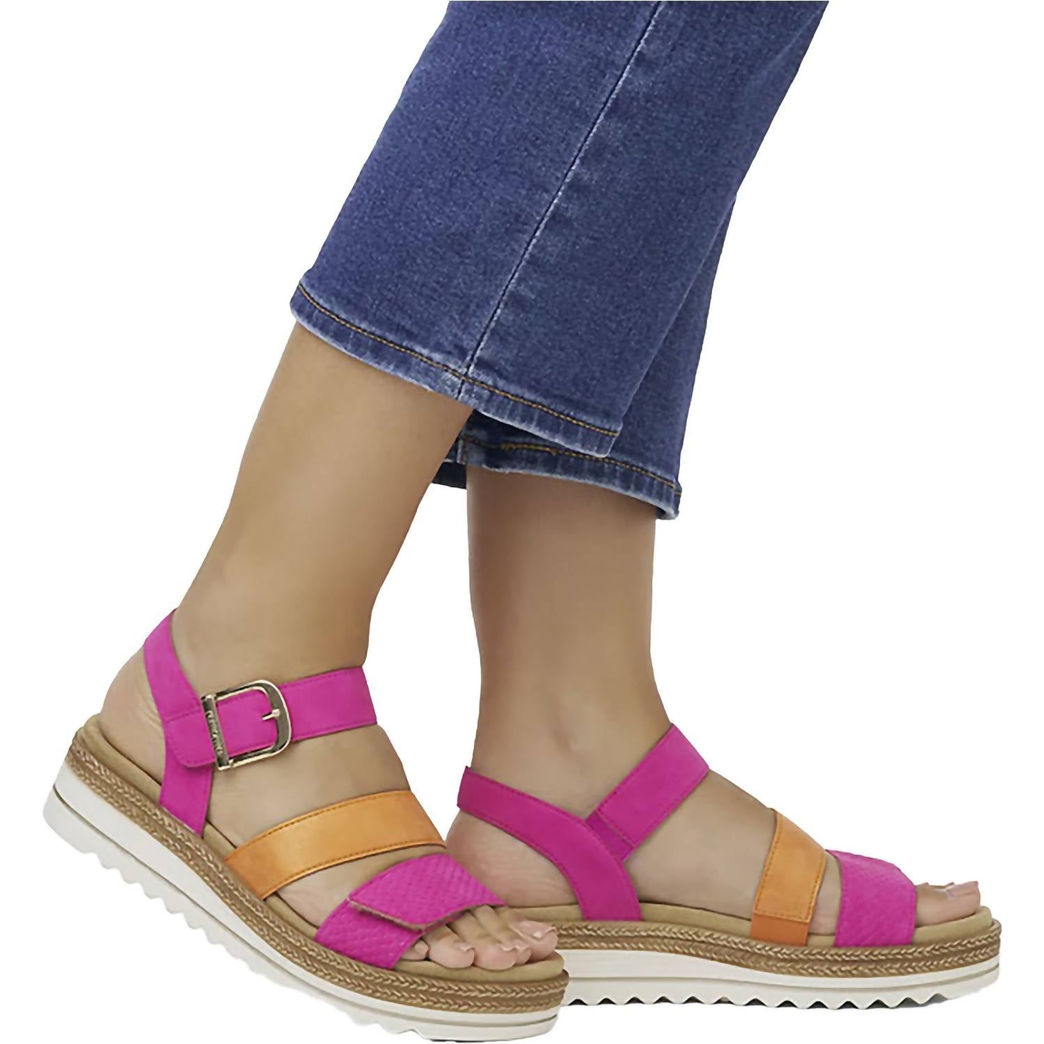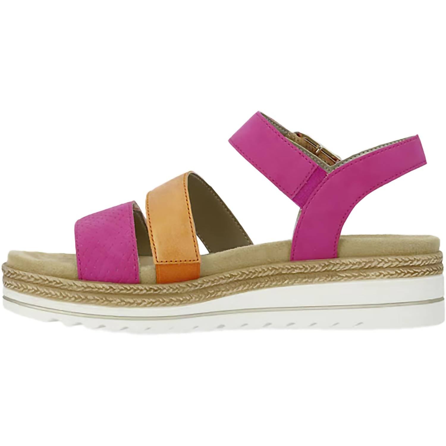 This sandal will take you from brunch to dinner and everything in between. Discover unparalleled comfort and style with the Remonte D0Q55 Women's Strappy Sandals in vibrant magenta and orange. These sandals feature a chic open toe design and a 1.57-inch flat heel, perfect for the spring season. Crafted from vegan synthetic leather with a synthetic inner material, they offer an extra soft removable footbed and an ultra-light PU outsole for maximum flexibility. The individually adjustable Velcro fastener ensures a perfect fit, making them both a fashionable and eco-friendly choice.