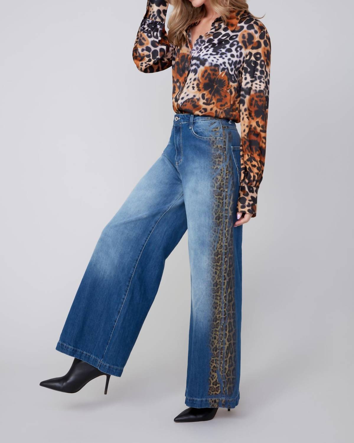 Introducing the Wild Side Wide Leg Pant by Renuar, a striking addition to your wardrobe in bold blue cheetah print. This pant features a relaxed fit with practical back and hip pockets, belt loops, and a button-front zipper for a secure closure. With a wide-leg silhouette and animal pattern, it offers a blend of comfort and sophistication, perfect for spring dinner parties. Care instructions include machine wash and tumble dry for easy maintenance.