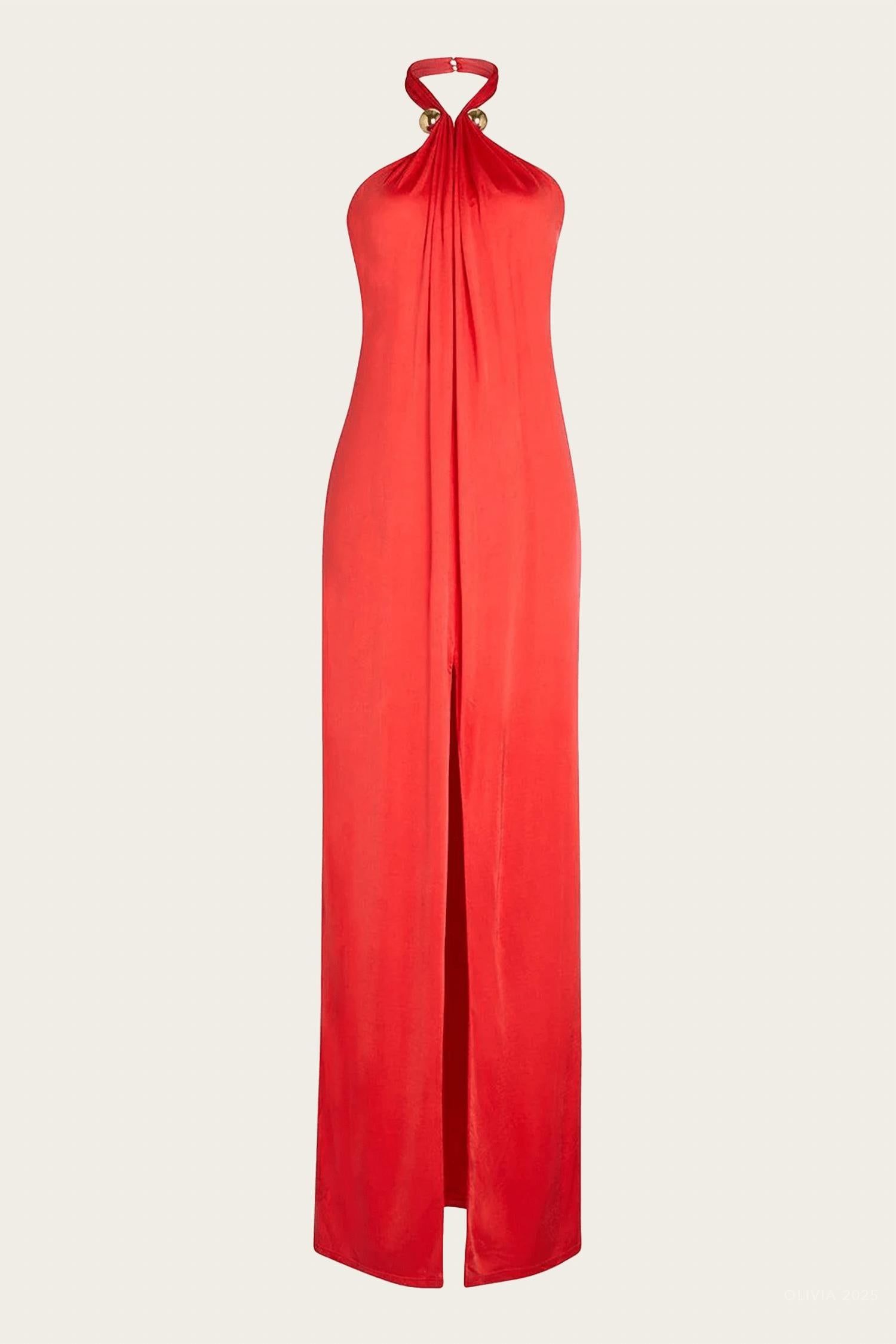 Style this maxi with your favorite statement necklace and sandals for the perfect look. Introducing the Becs Maxi Dress by Retrofete, a captivating evening option in vibrant Geranium. This sleeveless masterpiece is crafted from 100% Viscose, offering luxurious comfort and a flowy A-line silhouette perfect for maximalist trends. Made to standard sizing and featuring a halter neckline, this dress boasts an elegant zip closure for easy wearing. Originating from overseas, it is best maintained by dry cleaning to ensure its pristine condition.