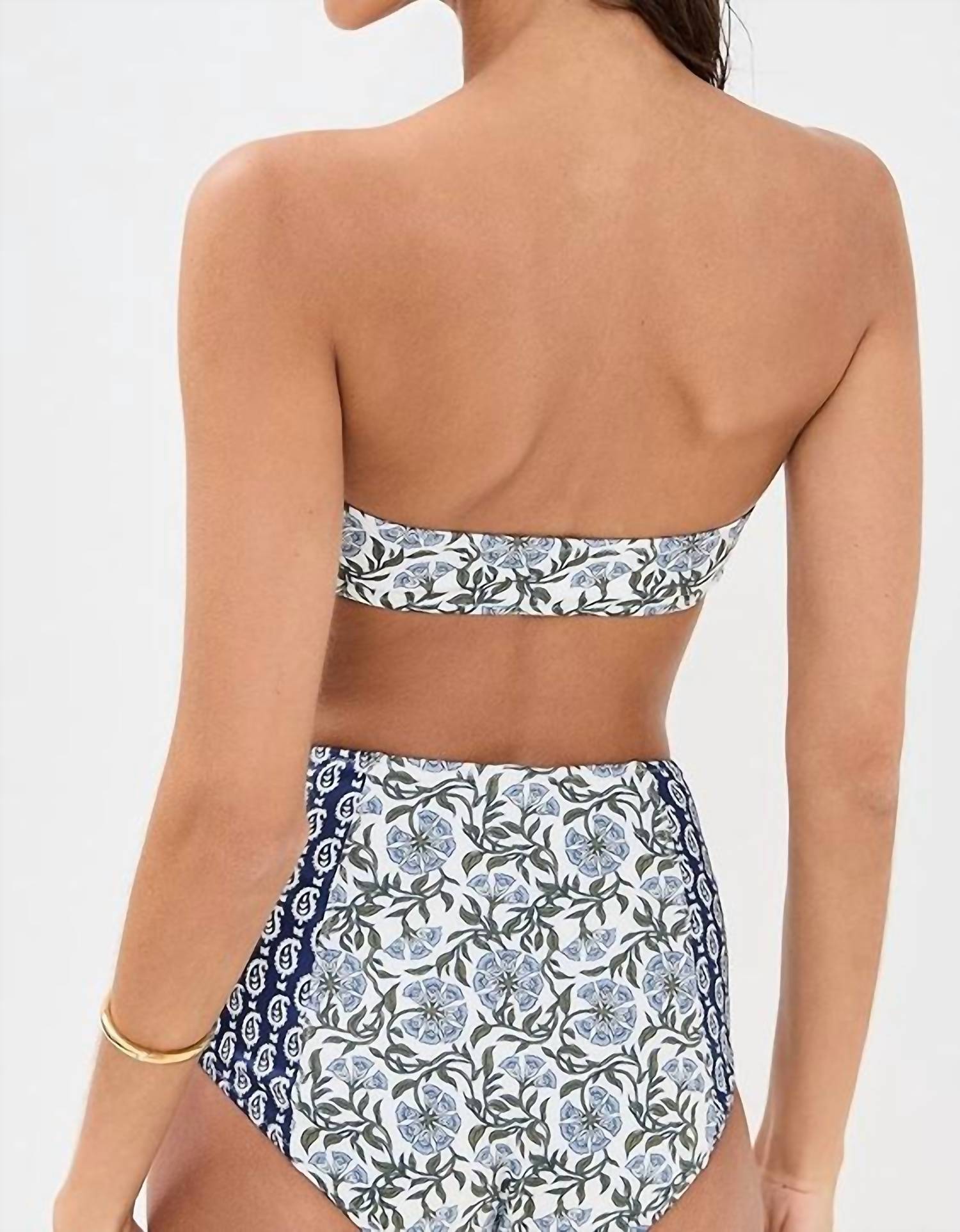 Dream of your next beach getaway in this cute little number. Pair with strappy sandals, a floppy hat, and an oversized tote to complete the perfect vacation look. Elevate your summer style with the Mala Bandeau Bikini Top by RHODE, featuring a captivating Blue Trumpet Vine Mini print for a boho chic touch. Tailored from a shell of 75% polyester and 25% spandex, complemented with a lining of 80% nylon and 20% spandex, this piece ensures both comfort and style. The swim top boasts a structured U notch and boned side seams for a flattering fit, along with a non-slip rubber binding at the top hem. Care: Hand wash. Perfect for beach days with its medium coverage and patterned design.