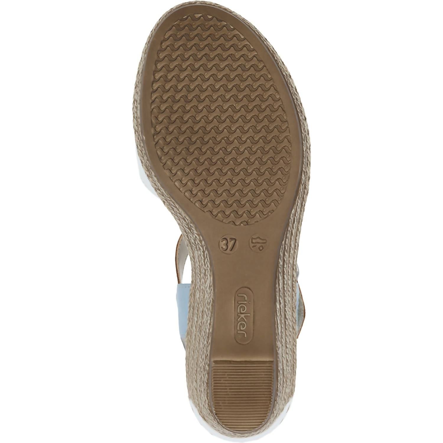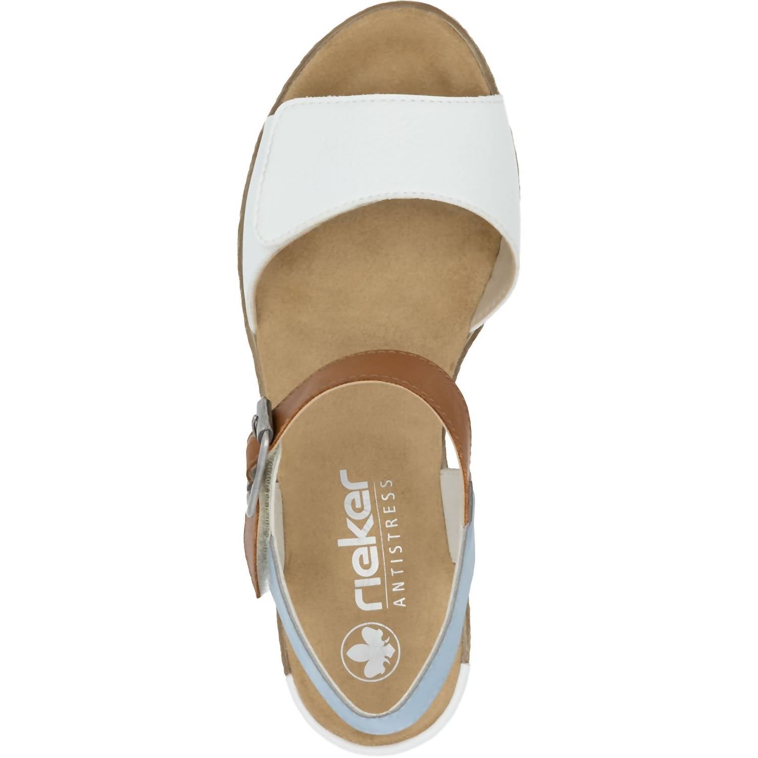 Flowy dresses, cropped pants, and even jumpsuits... this sandal works with them all! Introducing the Women's Fanni Sandals by Rieker, a sophisticated choice for your spring vacation wardrobe. These sandals feature a mid wedge heel of 2.17 inches and two adjustable straps for optimal fit, crafted from a synthetic upper in Weiss/Cayenne/Ciel. They boast Rieker Anti-Stress Technology, offering a combination of lightweight design, flexibility, and shock absorption to enhance comfort throughout your day. With an open toe and a RIRICON-sole, these sandals ensure a snug fit, enhancing both style and wearability for any streetwear trend.