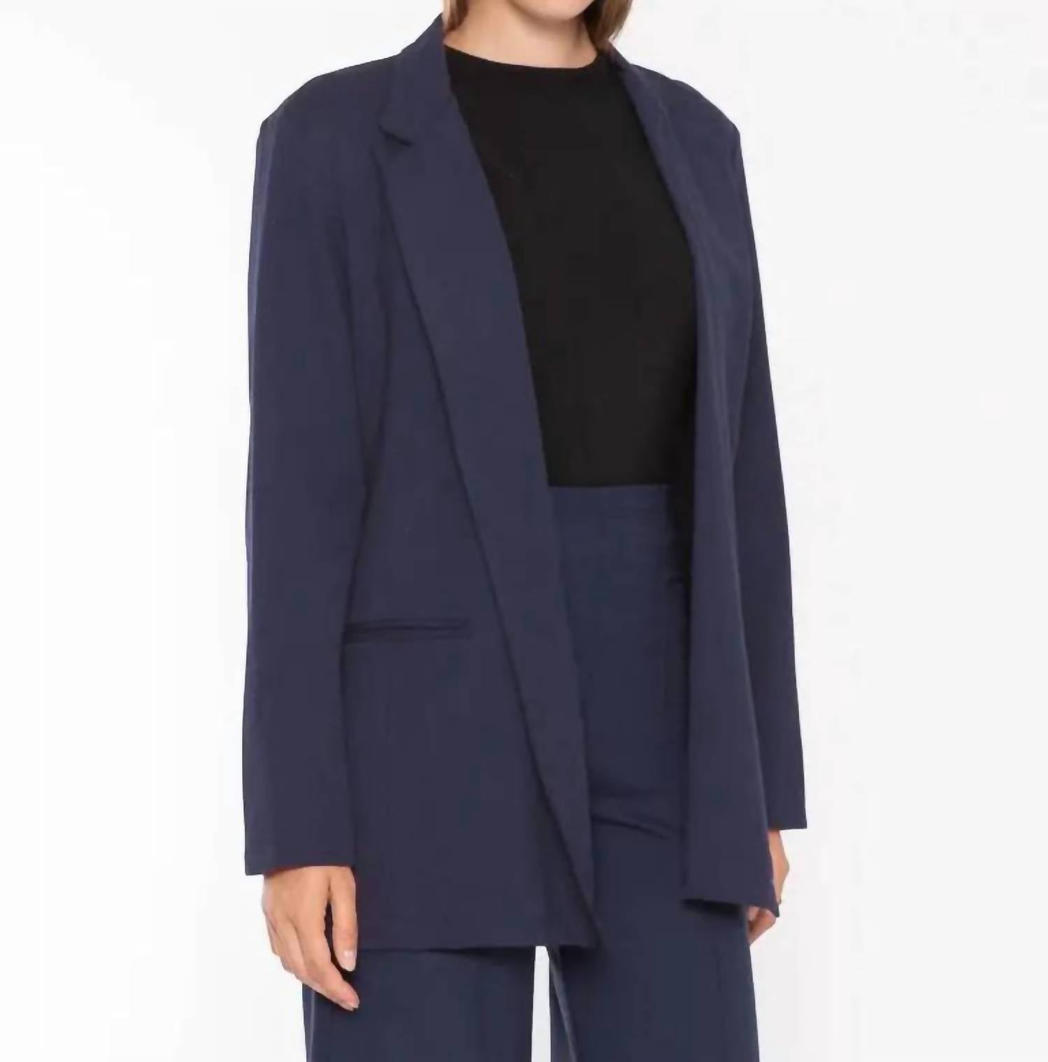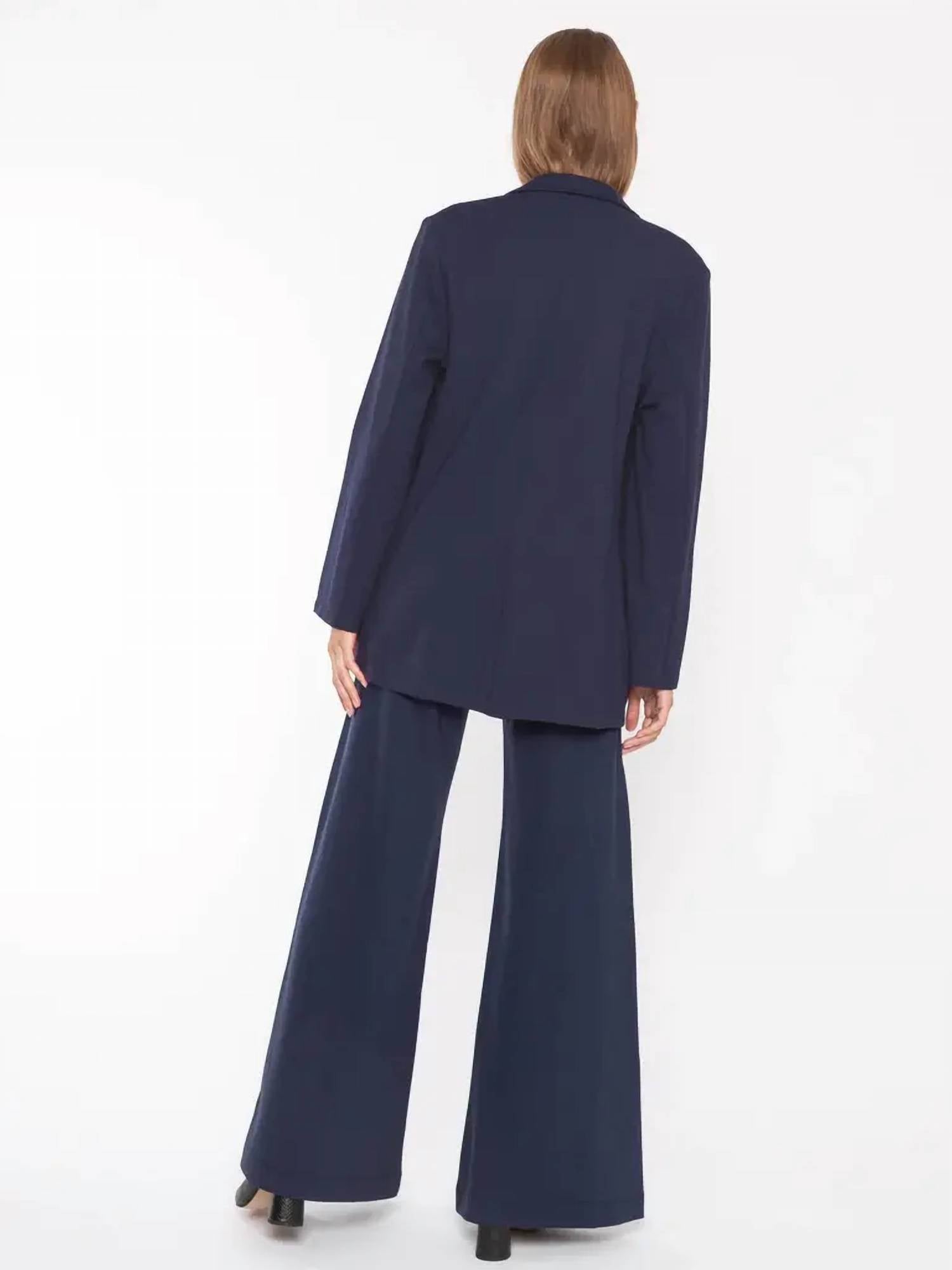 An elevated version of your favorite classic blazer. Meet the Navy Ponte Knit Oversized Blazer by RIPLEY RADER, a chic essential for any wardrobe. Designed with long sleeves for a polished look, this blazer boasts a luxurious blend of 68% Viscose, 27% Nylon, and 5% Stretch. Proudly made in the USA, it features self-lined lapels and deep pockets for added sophistication and utility. For best results, dry clean or hand wash and lay flat to dry.