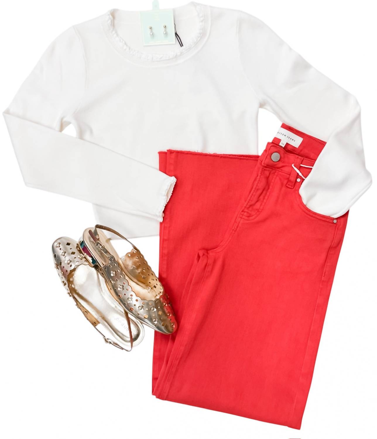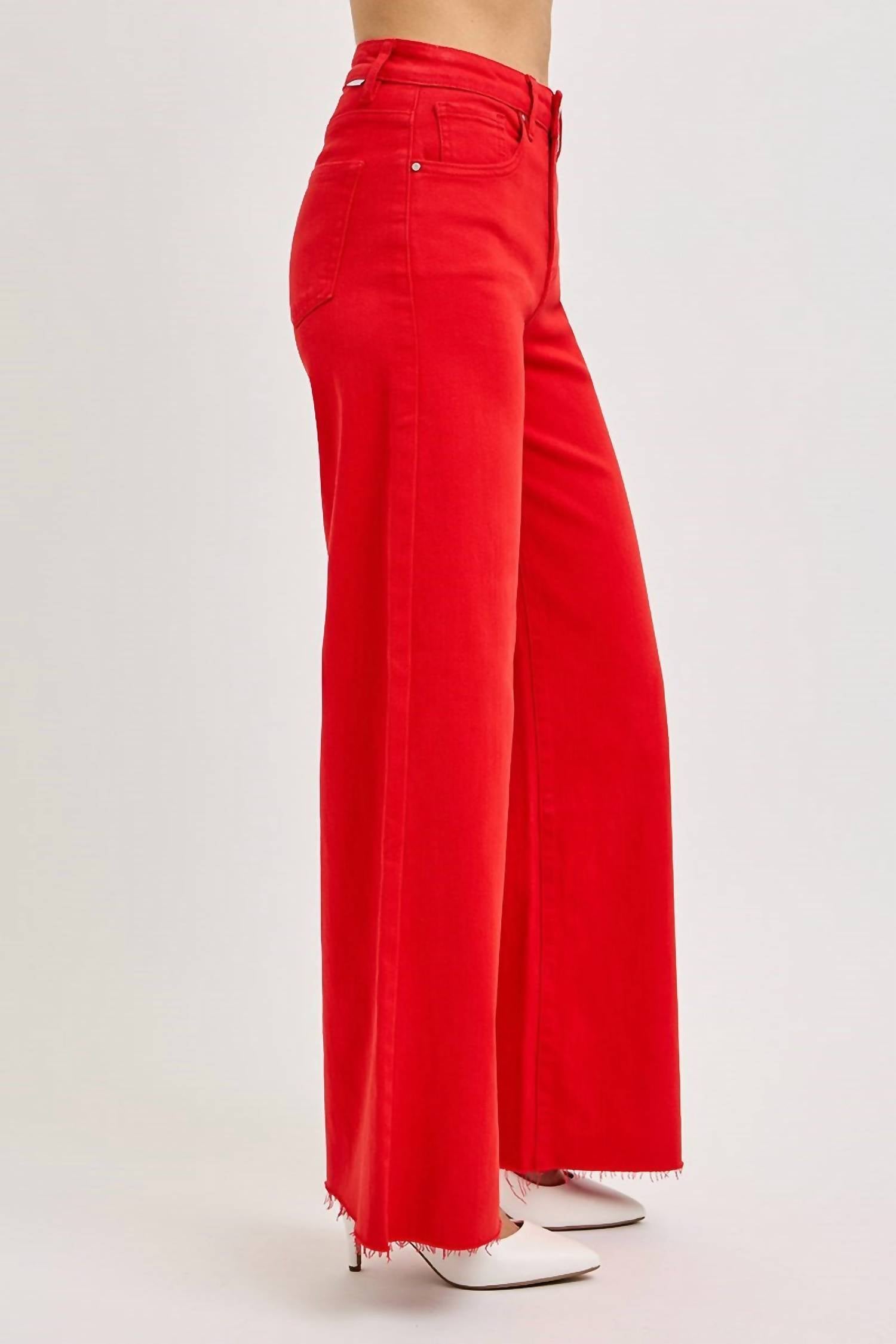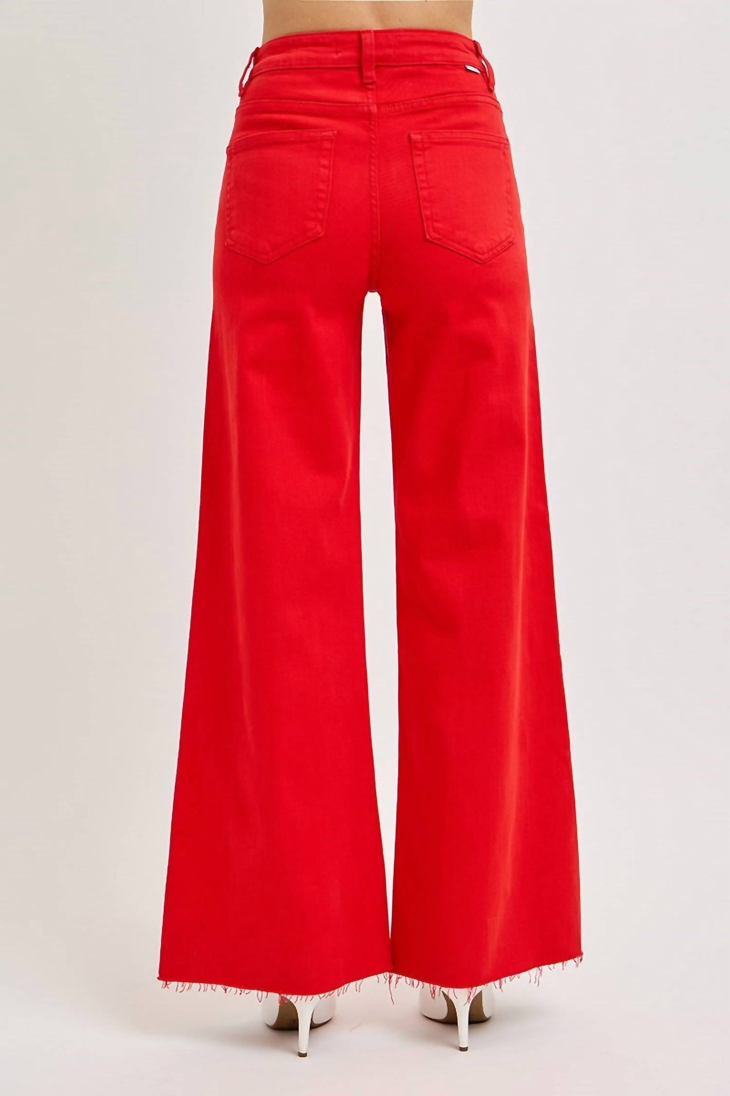 Step into style with the Gone Girl Fiesta High Rise Wide Leg Jeans by RISEN, crafted in a vibrant red hue. These jeans feature a high-rise fit, a relaxed silhouette, and a classic button closure for a perfect blend of comfort and fashion. Made from a cotton blend consisting of 92% cotton, 6% polyester, and 2% spandex, these jeans are both soft and flexible. With a 10 3/4" rise and 31" inseam in size 3/26, they promise a flattering fit. Care instructions: Machine wash and tumble dry. Model is wearing size 1 (5'8" height, 24" waist, 34" hips).