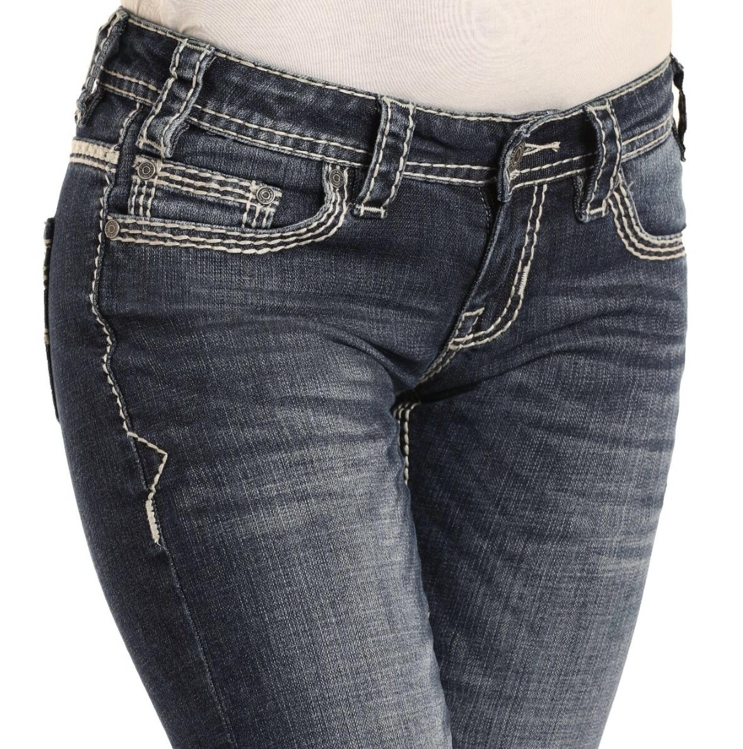 A boot-cut jean that not only looks good on, you'll be comfortable in them all day. Introducing the Cowgirl Midrise Bootcut Riding Jeans by Rock & Roll Denim, perfect for adding a touch of Western charm to your summer wardrobe. In a flattering dark vintage wash, these jeans feature a classic fit with a comfortable cotton blend material and a stylish bootcut leg. They come equipped with convenient pockets and a secure button closure. For easy care, simply machine wash and tumble dry, making them an ideal choice for New Year's Eve celebrations or a leisurely vacation.