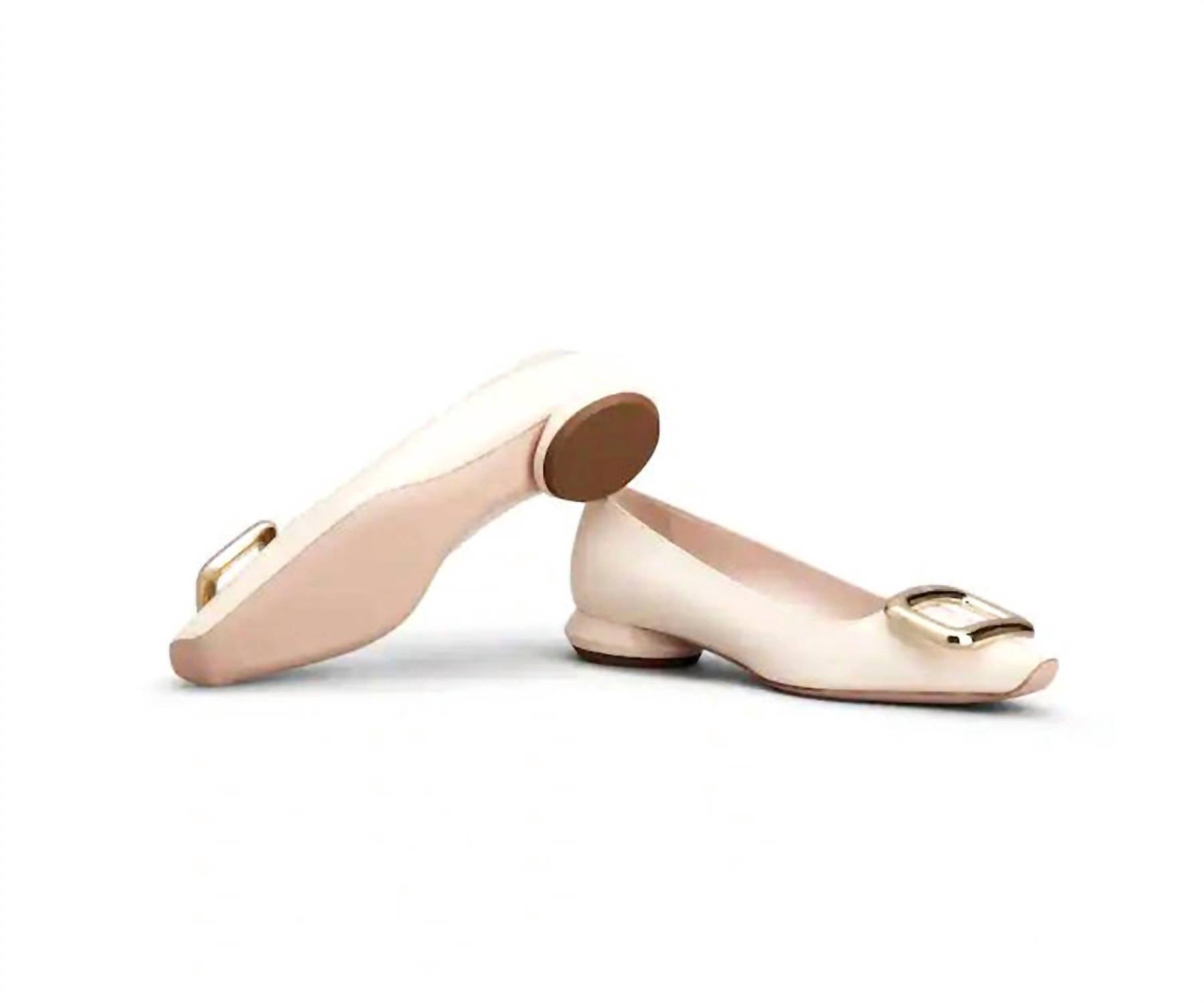 A classic loafer that is both comfortable and polished. Introducing the Viv Choc Metal Buckle Ballerinas by Roger Vivier, a stylish choice for minimalist spring wardrobes. Crafted in Italy, these beige flats feature a luxurious patent leather upper and are finished with a striking branded metal buckle for added sophistication. The squared toe and flat heel, measuring at 0.8 inches, blend elegance with comfort, making them perfect for church occasions. A leather outsole ensures durability, and each pair comes with maintenance and care cards, along with a branded dustbag for storage.