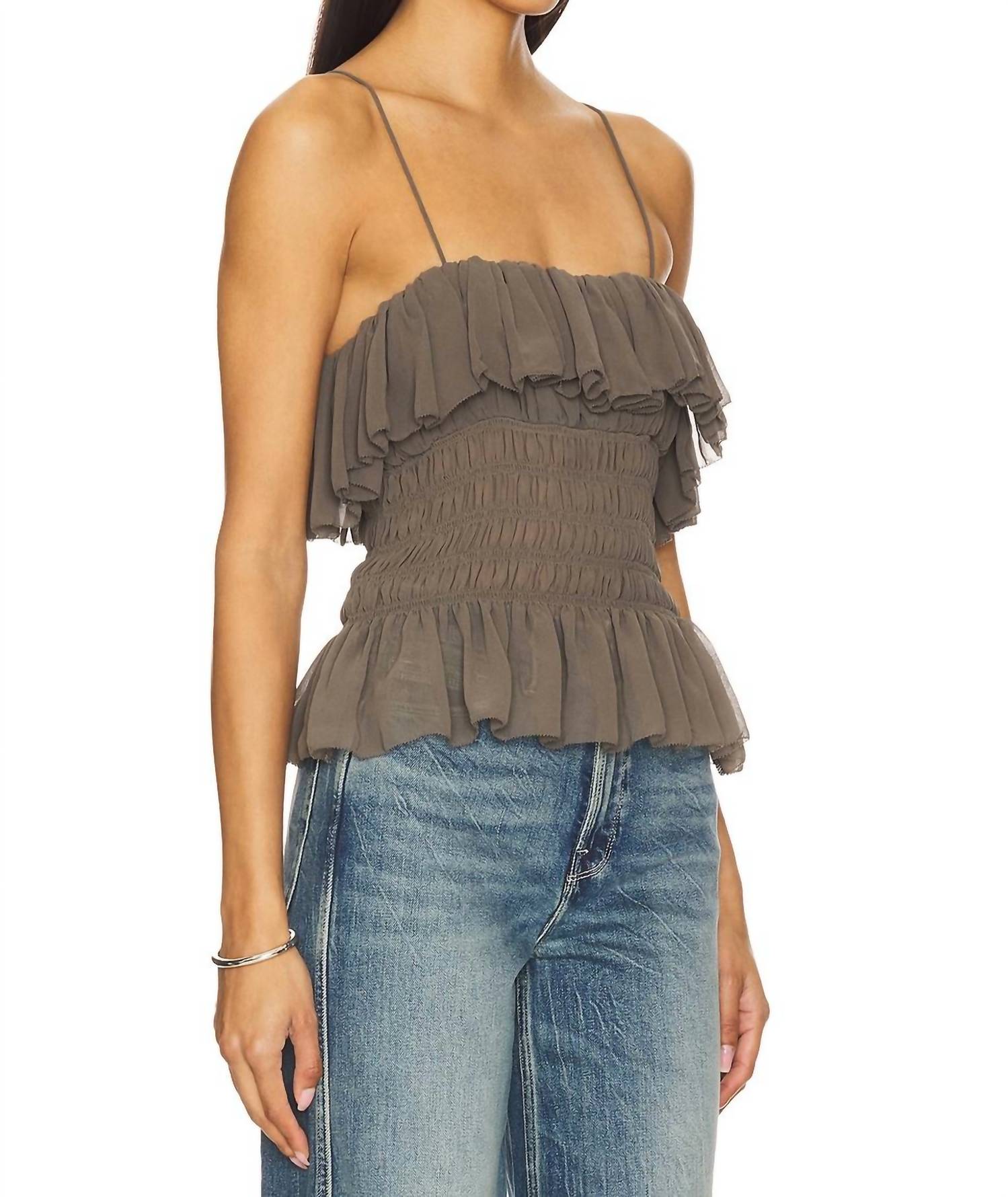 This classic, short sleeve tee will be your go-to staple this season and beyond. Add timeless elegance to your wardrobe with the Alexi Sleeveless Top by Ronny Kobo, designed in a chic pebble hue. This women's top features delicate spaghetti straps and a stylish square neckline, crafted from 100% polyester with smocked chiffon and ruffle detailing. The pull-on closure offers ease, making it perfect for sophisticated summer evenings or dinner parties. Care instructions ensure longevity: Machine wash cold and lay flat to dry.