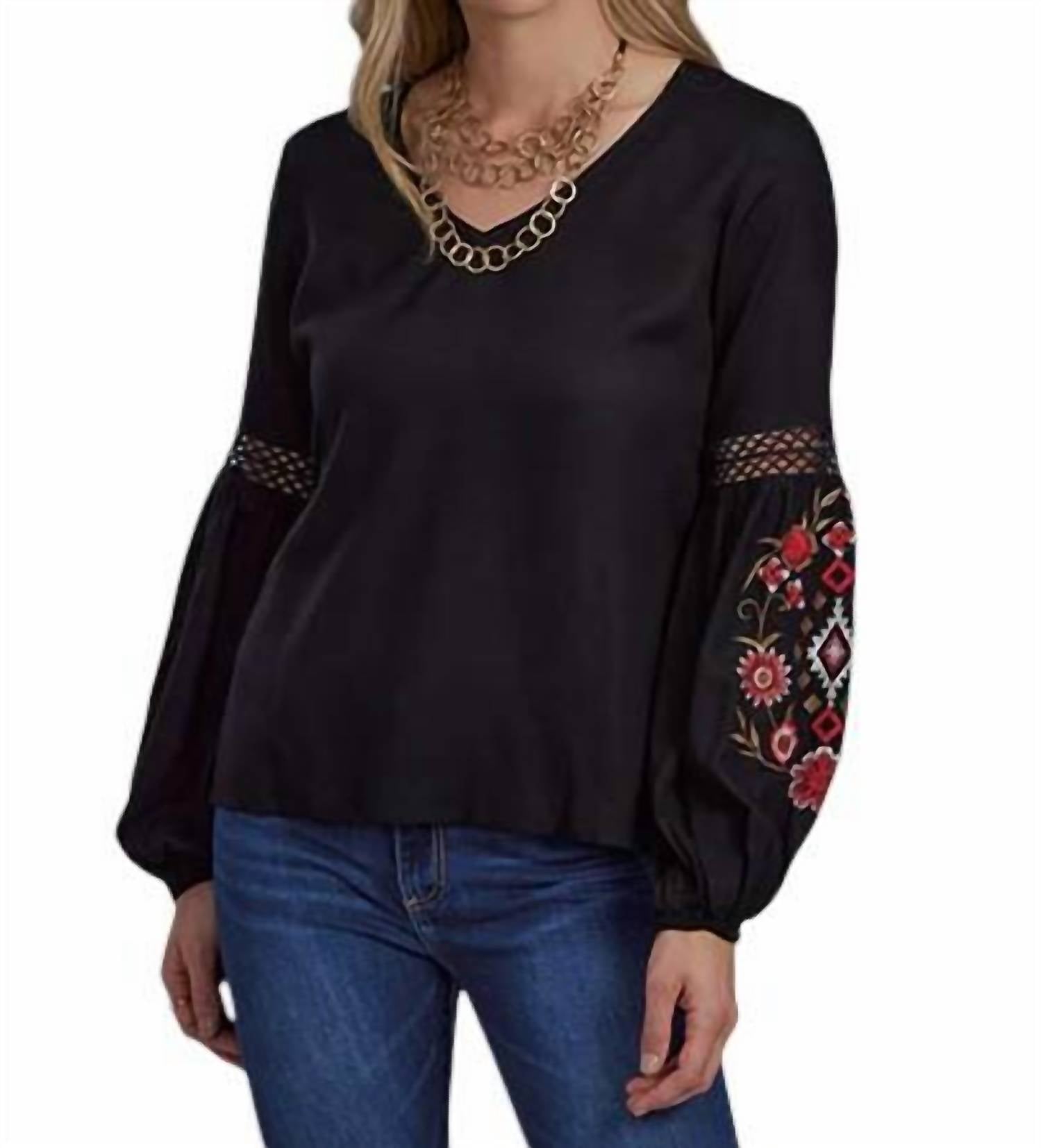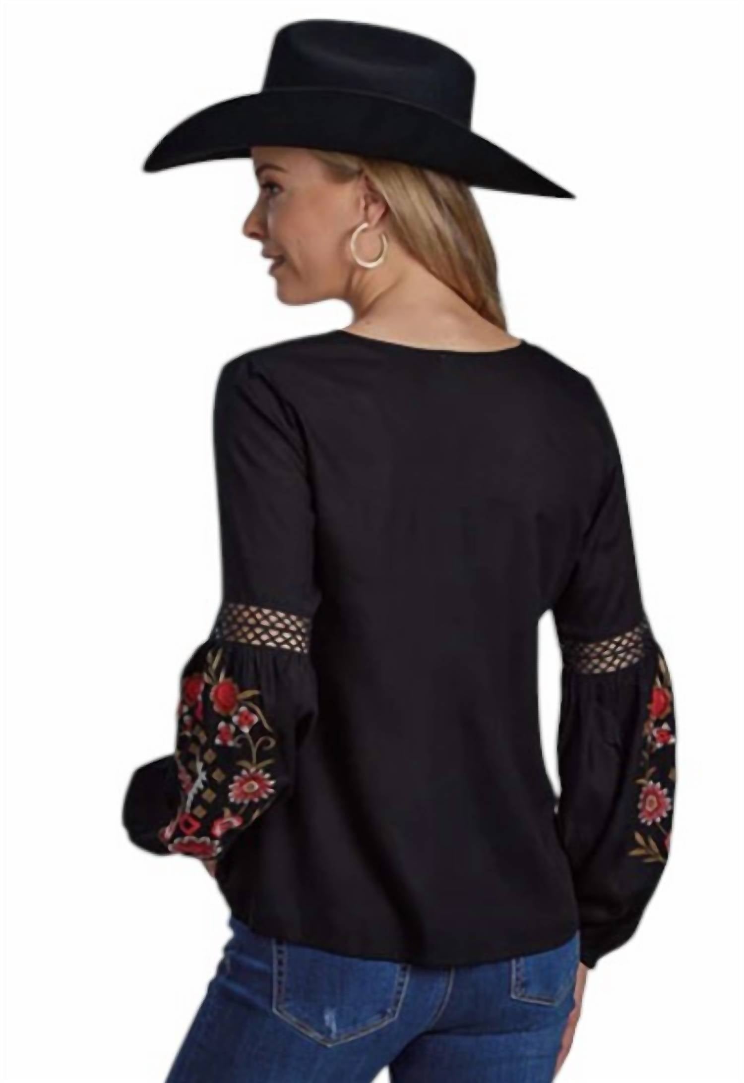 A versatile blouse that works from desk to dinner! Embrace a boho flair with the Ladies Embroidery Rayon Blouse by ROPER, designed to inspire effortless style. This blouse features long bishop sleeves with crochet lace inserts and cheerful Aztec and floral embroidery on the lower sleeves, all crafted from luxurious black rayon challis. The flattering V-neck enhances the elegant silhouette while the pull-on closure ensures ease of wear. Perfect for layering or wearing solo, this top is a statement piece for any spring occasion.