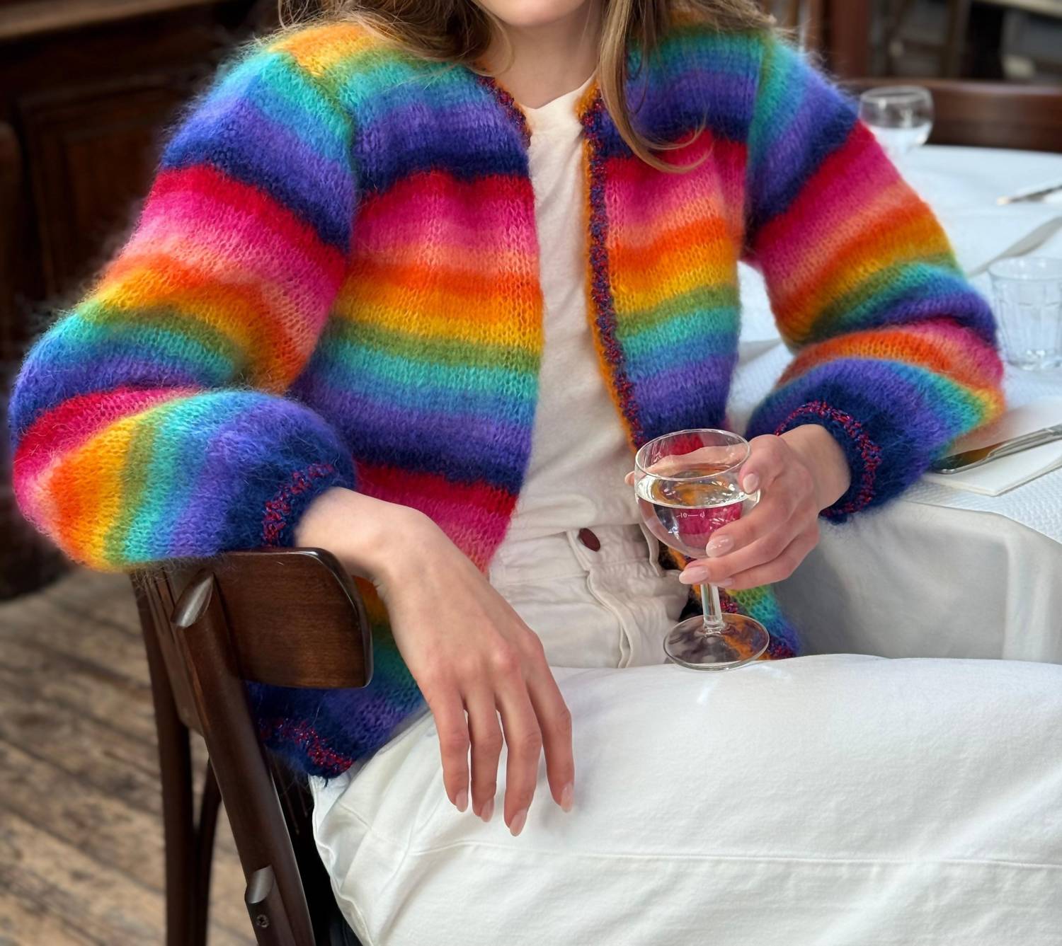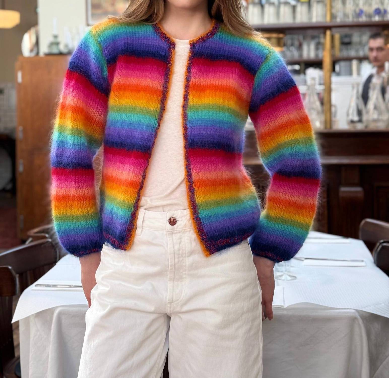 This cardigan will be a sweater-rotation favorite. Introducing the Mini Jacket Stripes Cardigan by Rose Carmine, a vibrant piece guaranteed to make a statement. Featuring long sleeves and a chic crewneck, this cardigan is made with a luxurious mohair blend and is knit by hand. Its cropped length and bold rainbow stripe pattern are crafted in France, providing an artisanal touch. The pull-on design and care instructions of hand wash and lay flat to dry ensure both convenience and longevity for your wardrobe.