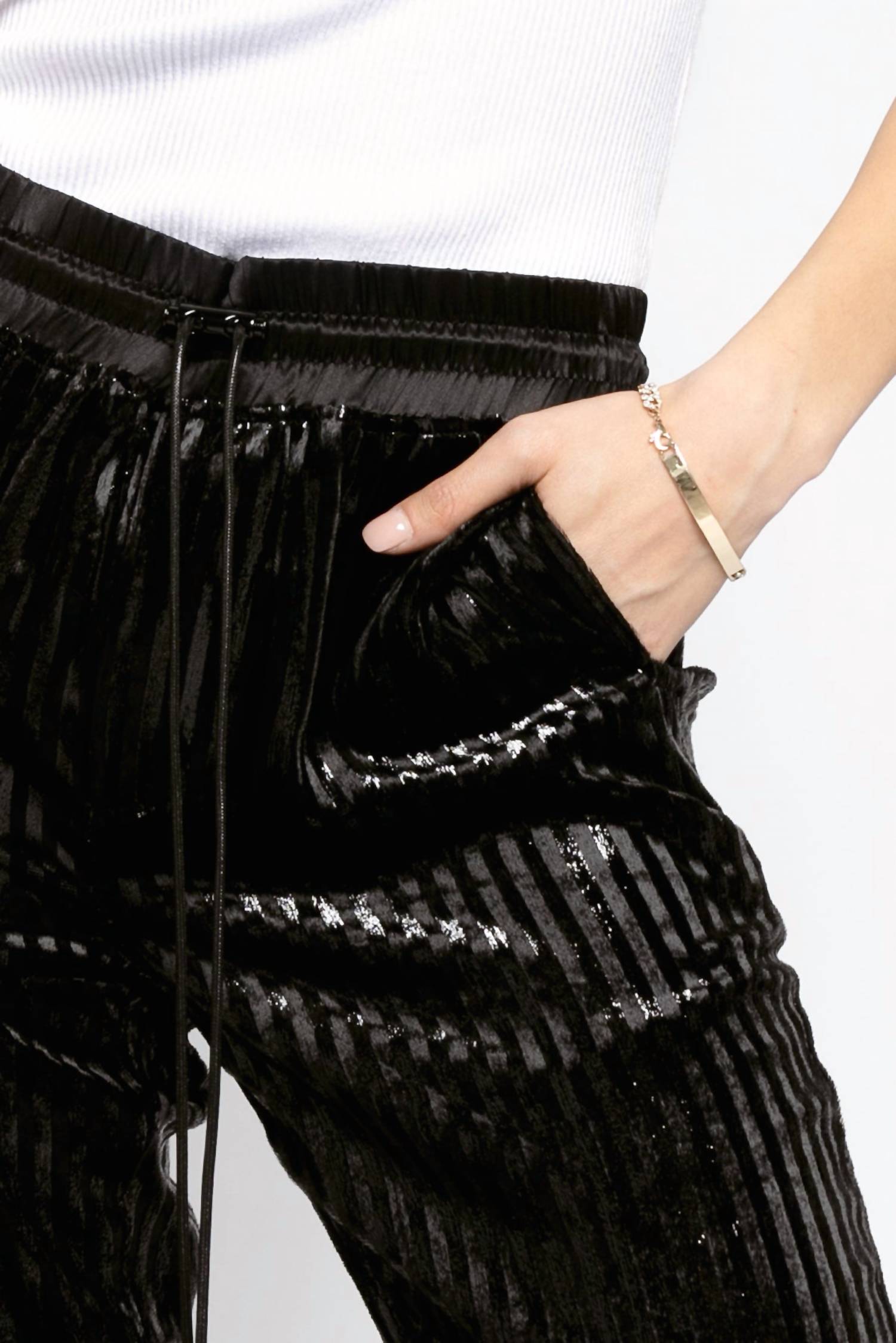 A straightleg pant that workes season after season. Dress these up with your favorite blouse or keep it casual with your go-to tee. The RtA Fiona Pant in Velvet Stripe offers a luxurious pajama-style design crafted from a premium Italian velvet blend, featuring a shimmering lurex-striped pattern. Made with 40% nylon, 40% viscose, and 20% silk, these pants include a 100% silk contrast and a lining of 97% polyester and 3% spandex. Originating from the PRC, these straight-leg pants feature a pull-on closure with wax-coated drawstrings for a relaxed fit. Ensure longevity by dry cleaning only.