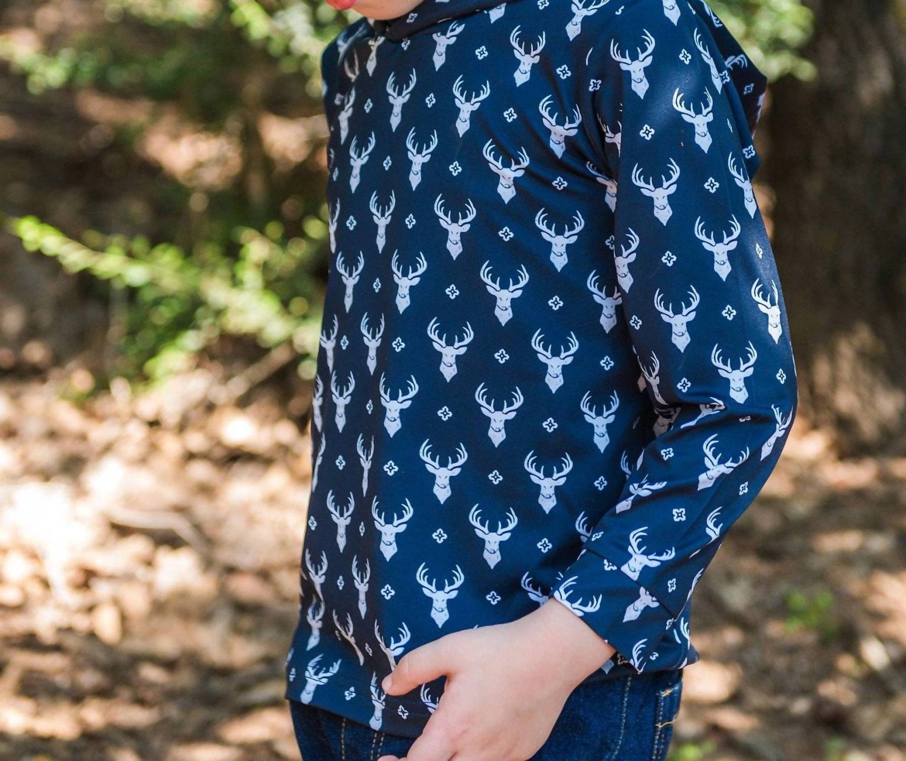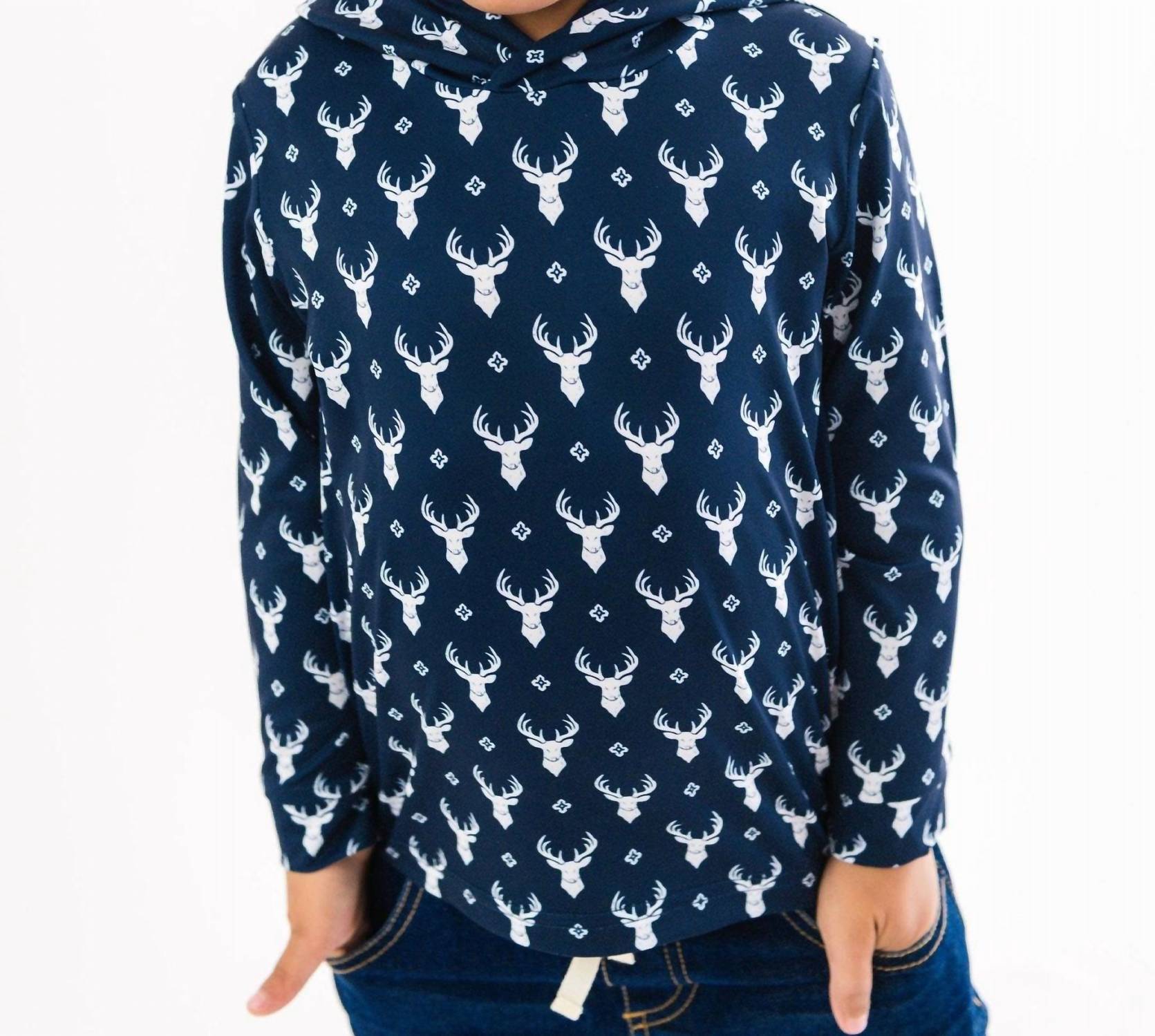 Introduce your young adventurer to comfort and style with the Boys' Long-sleeve Little Deer Lodge Performance Hooded Shirt from RuffleButts. This long-sleeve navy shirt is crafted from a smooth, stretchy knit blend of 90% polyester and 10% spandex, designed for active play with its breathable fabric and cozy hood. adorns a bold "Little Deer Lodge" deer-head tile print that adds a touch of outdoorsy charm. Easy to care for, just machine wash cold and tumble dry low. Perfect for layering or wearing solo, this piece is made for every adventure.