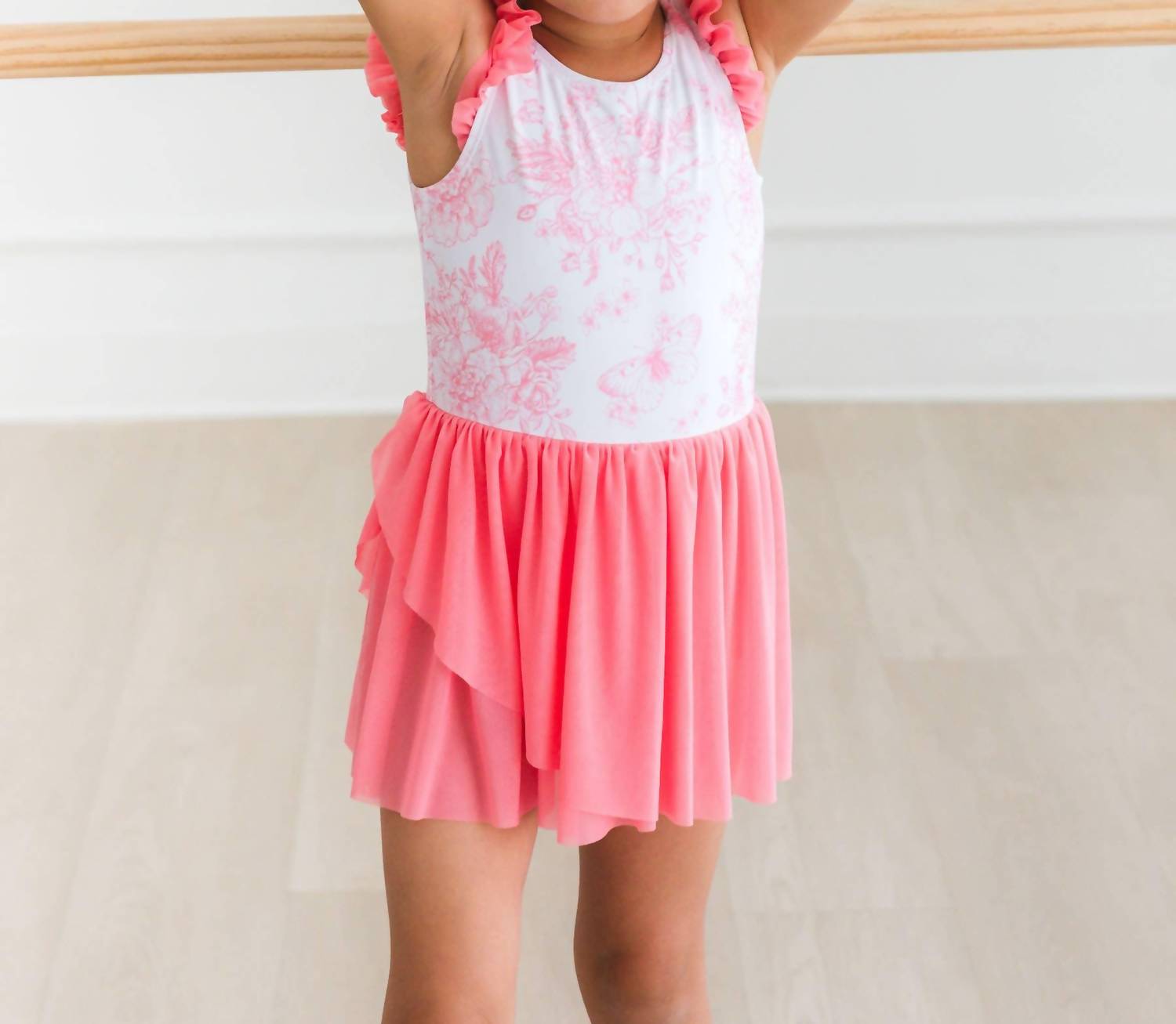 Elevate her dance and gymnastics wardrobe with the Girl's Bubblegum Pink Butterfly Garden Toile Flutter Sleeve Leotard by RuffleButts. Designed with enchanting flutter sleeves and a soft mesh skirt, this leotard is crafted from 80% Nylon and 20% Spandex for comfort and stretch. The charming floral pattern adds a touch of whimsy, perfect for spring pursuits in a boho chic style. Care for this piece is easy: machine wash cold with like colors, avoid bleach and ironing, and tumble dry as needed.