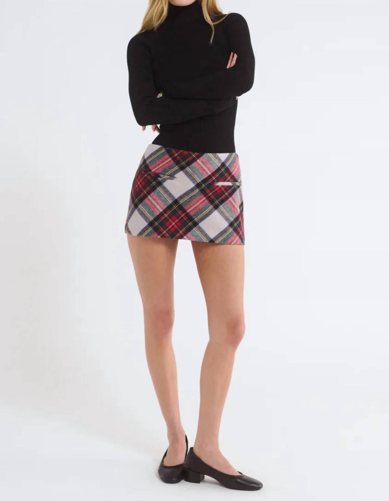 The perfect mini skirt does exist. Introducing the Holiday Micro Skort by Rumored, a chic low-rise mini designed for the holiday season. Crafted from 63% Polyester, 33% Rayon, and 4% Spandex, this skort features a festive Mistletoe Plaid print with concealed shorts underneath. Designed for easy styling with a pull-on closure, this trendy piece combines a nostalgic feel with a modern aesthetic. Please note the care instructions require dry cleaning to maintain its fresh appeal.