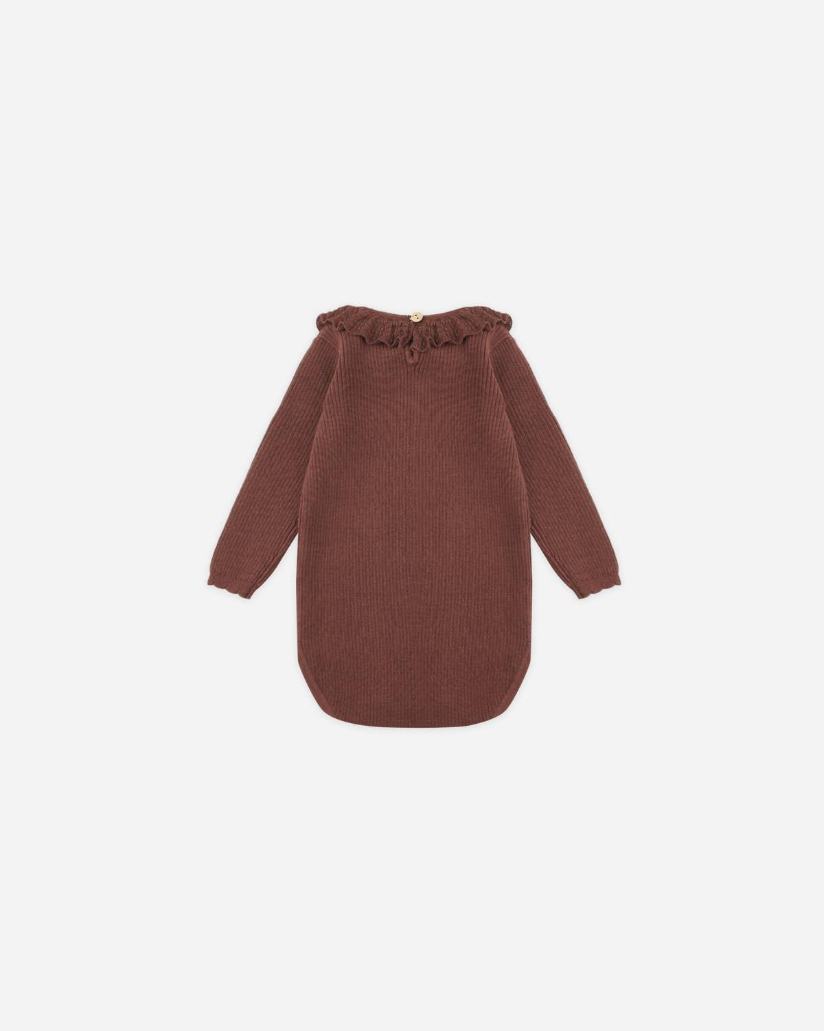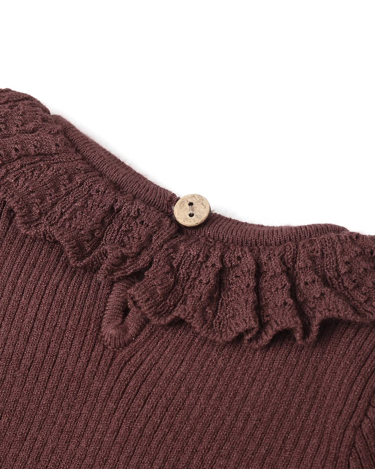 Introducing the Kids Ruffle Collar Bodysuit by Rylee + Cru, a unisex staple in a rich burgundy hue perfect for Thanksgiving and beyond. This charming bodysuit features an adorable ruffle collar and practical back button closure, along with bottom snaps for easy changes. Crafted from a soft viscose blend (55% Viscose, 27% Polyester, 16% Polyamide, 2% Elastane), its minimalist design makes it ideal for fall layering. Care: Machine wash and tumble dry.