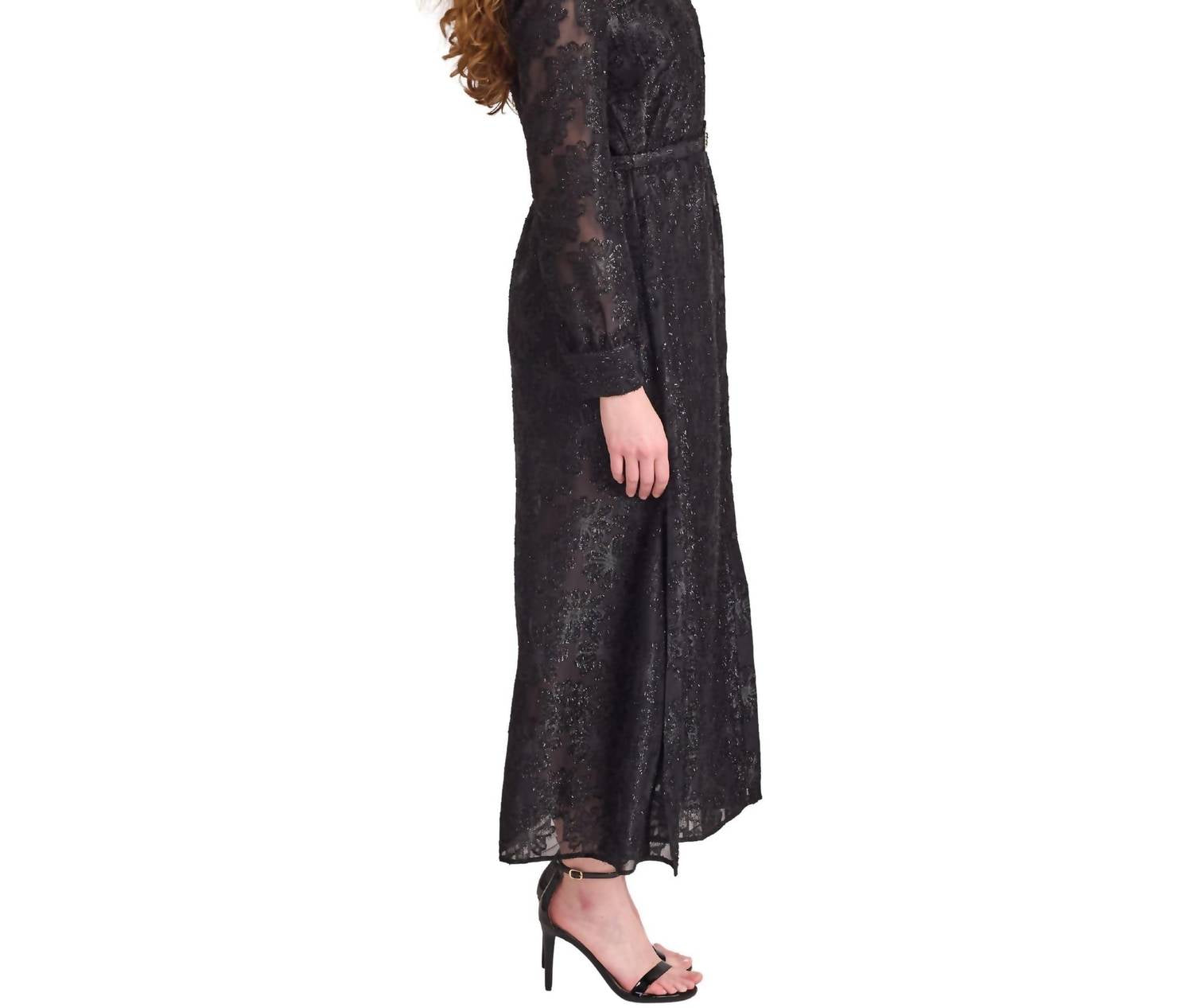 A maxi dress that is just as cute as it is comfortable. Introducing the Fiona Lace Maxi Dress by S'edge, a sophisticated piece in Onyx Floral designed to captivate with its timeless elegance. This dress features long sleeves, a refined collar, and an A-line silhouette with a belted waist that beautifully defines your figure. Closure: Button closure. Care: Dry clean only. Perfect for evening events, this full-length dress is ideal for adding understated glamour to your Thanksgiving wardrobe.