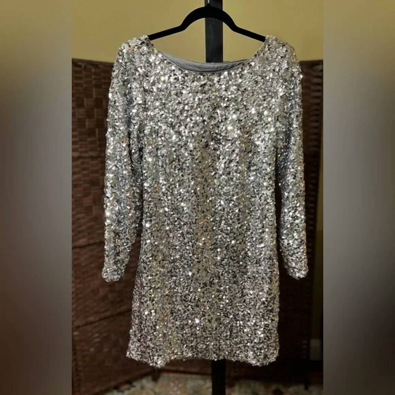 The perfect mini dress for those warmer months. Elevate your cocktail party look with the Cameron Sequin Mini Dress by SACHIN & BABI, an eye-catching piece in shimmering silver. This minimalist shift dress features long sleeves and a sophisticated boatneck, with a trendy cowl back detail. Made from 100% Polyester and crafted for a glamorous fall evening, this patterned mini is approximately 33.5 inches in length. Closure is an easy pull-on, with care instructions recommending dry cleaning for best results. The model is 5'10" and wears a size 2.