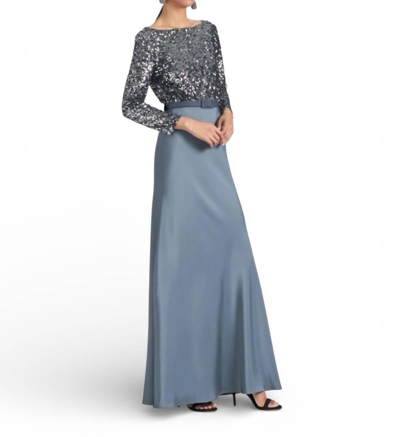 Cute and comfortable, this long sleeve dress has it all. Embrace elegance with the Colette Gown by SACHIN & BABI, showcasing long sleeves and a chic boat neckline. This evening dress, crafted from luxurious satin crepe, features a sequined bodice and a long slim skirt, perfect for any fall event. The gown's stunning scoop back complements its minimalist design. Closure: Side zipper. Available in a sophisticated gunmetal shade.