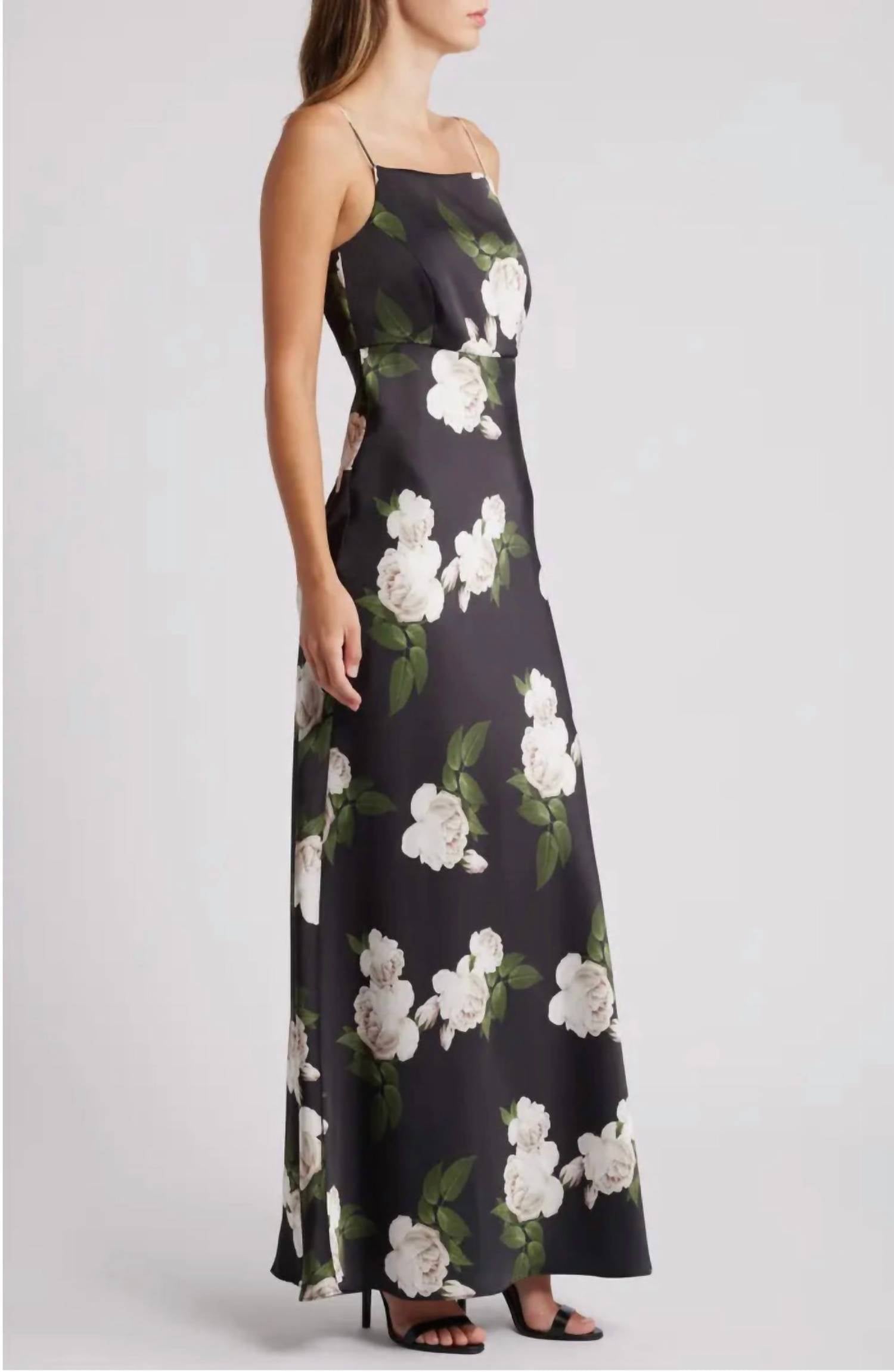 Who doesn't love a good maxi dress? This one you'll be reaching for season after season. Opt for the Shyla Gown by SACHIN & BABI for a stunning evening event look. This maxi dress in Obsidian Blooms exudes Boho Chic appeal, featuring a spaghetti strap design and A-line silhouette with a flattering square neckline. Achieve an effortlessly graceful appearance with its pull-on closure, perfect for summer soirées. Enjoy the intricate floral pattern that adds a touch of elegance without the fuss of pockets.