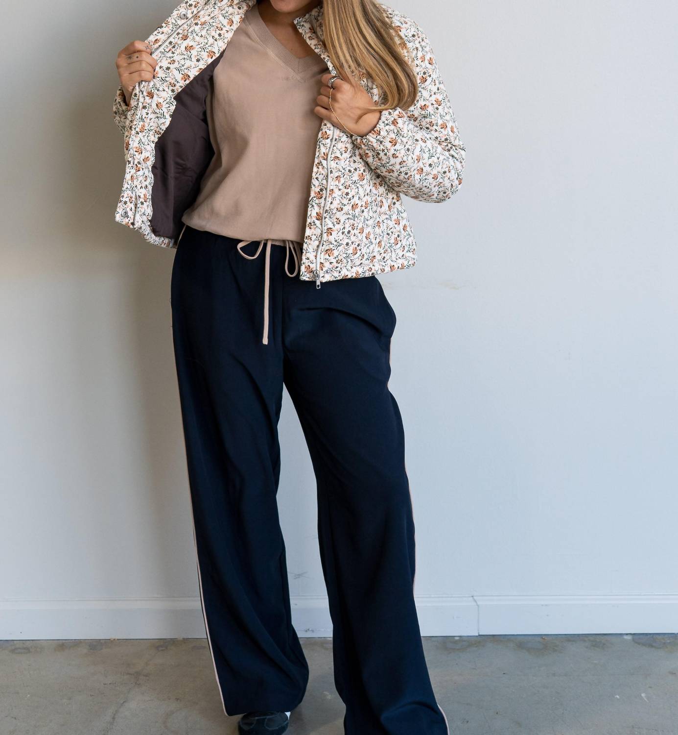 Cozy, cute and timeless. The puffer jacket that will keep you warm all season long. Elevate your fall wardrobe with the Sadie & Sage Just Looking Floral Cord Jacket, perfect for Thanksgiving travels. This women's jacket features long sleeves and is expertly crafted from 100% polyester, offering a cozy yet stylish fit with its floral pattern and puffed design. It is waist-length and designed with a practical zip closure, making it a versatile addition to any ensemble. Care for this piece with ease, as it is machine washable, ensuring both style and convenience remain a priority.
