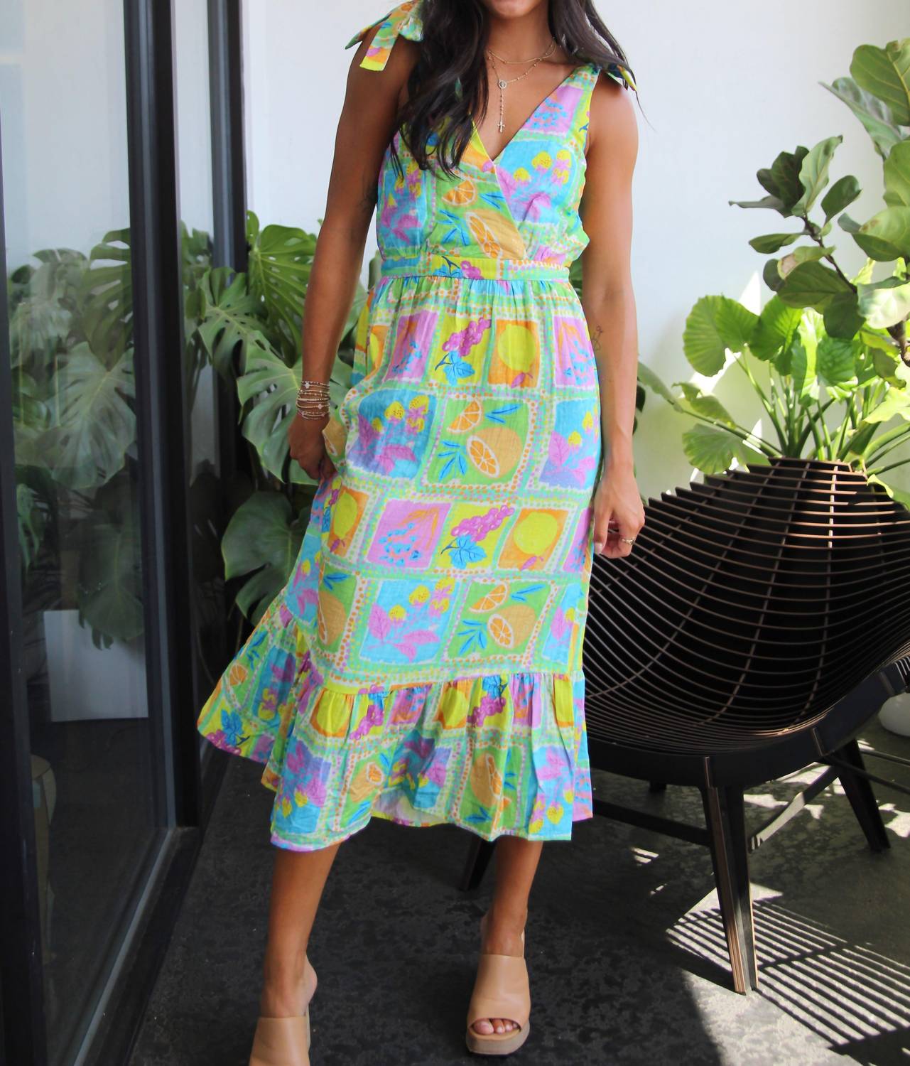 The perfect length dress does exist. Step into the summer season with the Mimosa Surplice Midi Dress by Sadie & Sage, an ideal choice for holiday parties. This sleeveless dress is patterned and features a V-neck neckline, offering both style and comfort. With its A-line silhouette, it effortlessly enhances any figure. Model Karlee (5'7") is wearing a size small.