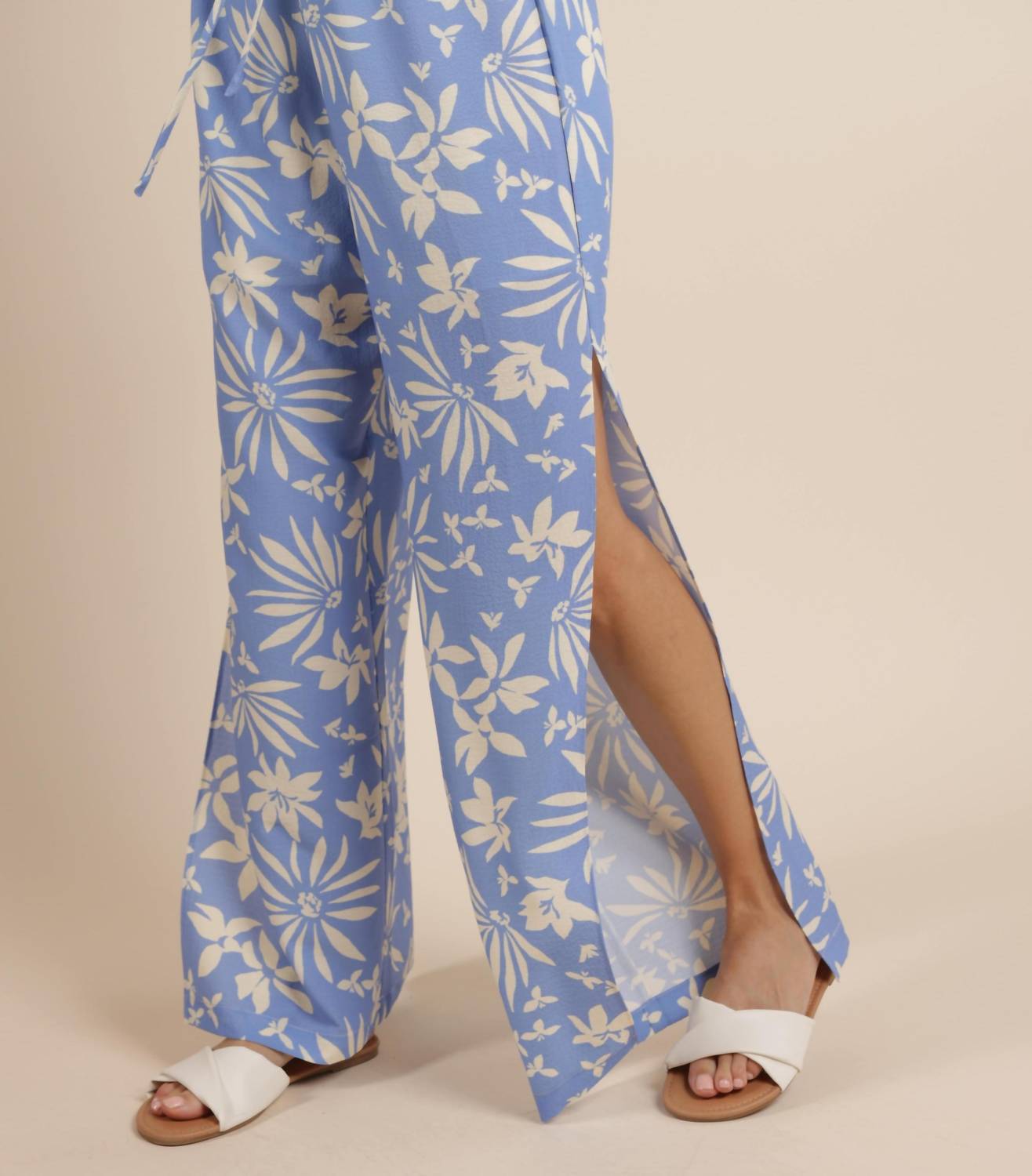Embrace the summer vibe with the Flower Trail Beach Pant With Leg Slit by SAGE THE LABEL, a perfect blend of flowy style and comfort in a captivating floral pattern. These women's pants offer a wide-leg silhouette with subtle side slits, crafted from a lightweight blend of 98% Polyester and 2% Elastane with an additional 92% Polyester and 8% Elastane lining for extra stretch. Designed in blue, ideal for beach lounging or a stylish brunch outing. Care: Machine wash.