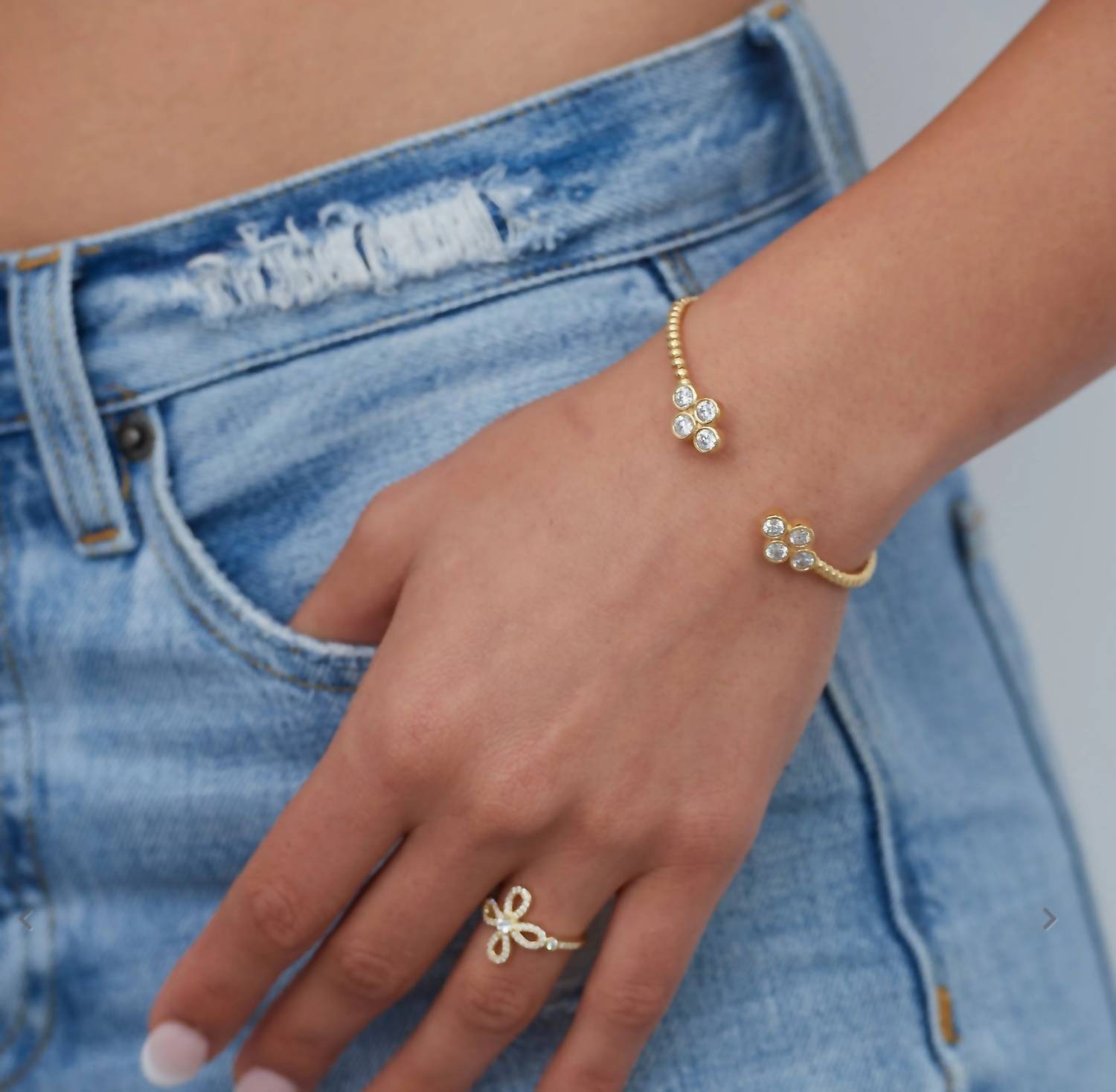 This bracelet will be your favorite go-to piece of the season. The Oriana Flower Cuff by SAHIRA combines elegance with playful charm, highlighting your fun and flirty side. This stunning cuff is crafted from 18k plated stainless steel and adorned with beautifully set CZ flowers, offering a luxurious gold finish. Adjustable to all wrist sizes, this bracelet is perfect for wearing solo or layered with other pieces for a striking look. Designed to last, it is water and tarnish resistant, making it a durable and stylish accessory for any occasion.