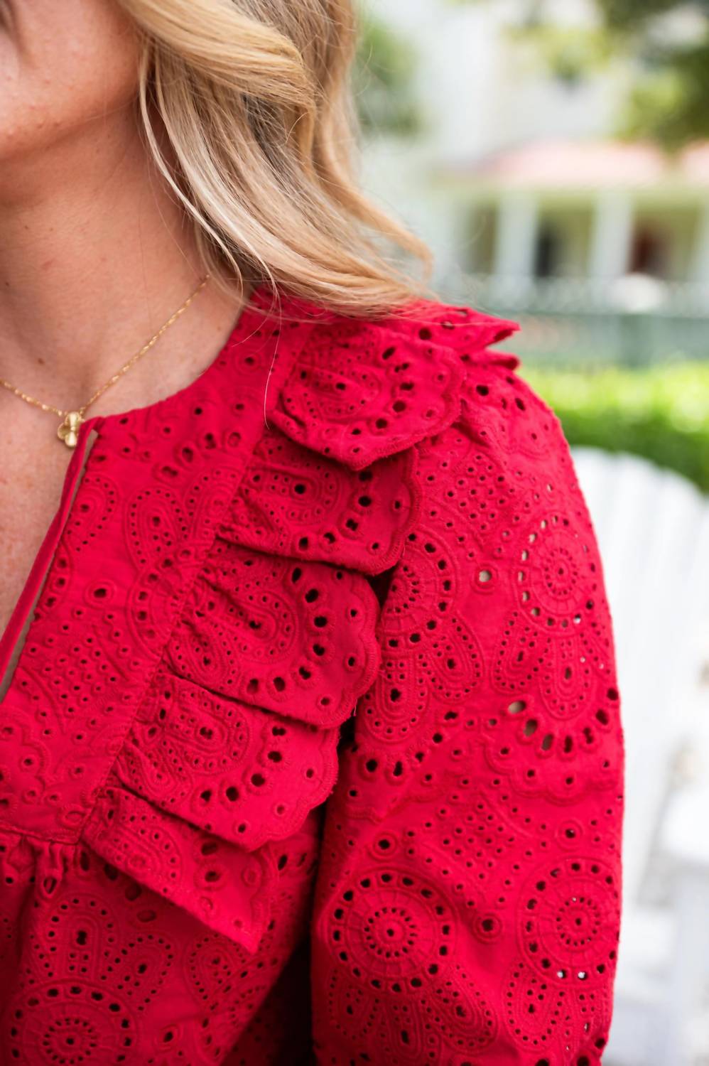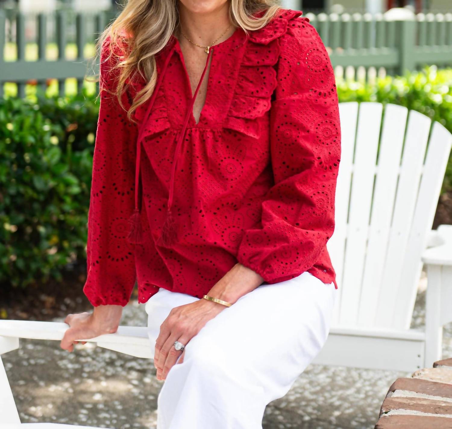 Pair this with your favorite jeans and slides for your next girls night out. Elevate your fall wardrobe with the Ruffle Front Top With Tassels by SAIL to SABLE, a chic addition in Chili Chili Pepper. Designed with long sleeves and crafted from intricate eyelet fabric, this women's blouse brings a boho chic touch with its scalloped hemline. Originating from an unspecified country, this top features a tie front closure and offers effortless pull-on styling. Care: Hand wash for best results.