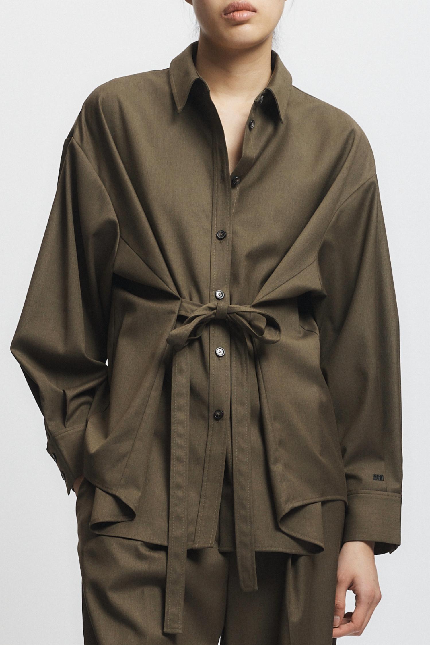 Perfectly tailored and soft to the touch. Experience the effortless style of the Kinn Oversized Shirt in Olive by Saint Art. This women's long-sleeve shirt brings a fresh, laid-back vibe with its relaxed fit and solid wool blend material. Crafted without pockets and featuring a classic button closure, it's perfect for layering during springtime workwear or vacation looks. Originating from a seamless blend of comfort and chic design, this shirt is best cared for with dry cleaning.