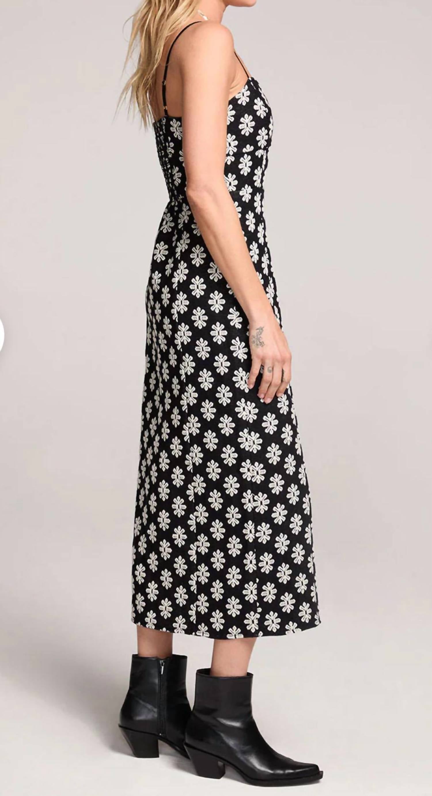 Just add slides or mules and you are good to go. Indulge in effortless elegance with the Dottie Midi Knit Floral Dress by Saltwater Luxe, adorned in a charming black and cream floral pattern. This women's dress boasts spaghetti straps and a flattering sheath silhouette, made from a soft cotton blend. Its pull-on closure and sweet midi length make it ideal for a myriad of occasions, from casual outings to a Thanksgiving dinner party. Care for this versatile piece by hand washing as needed.