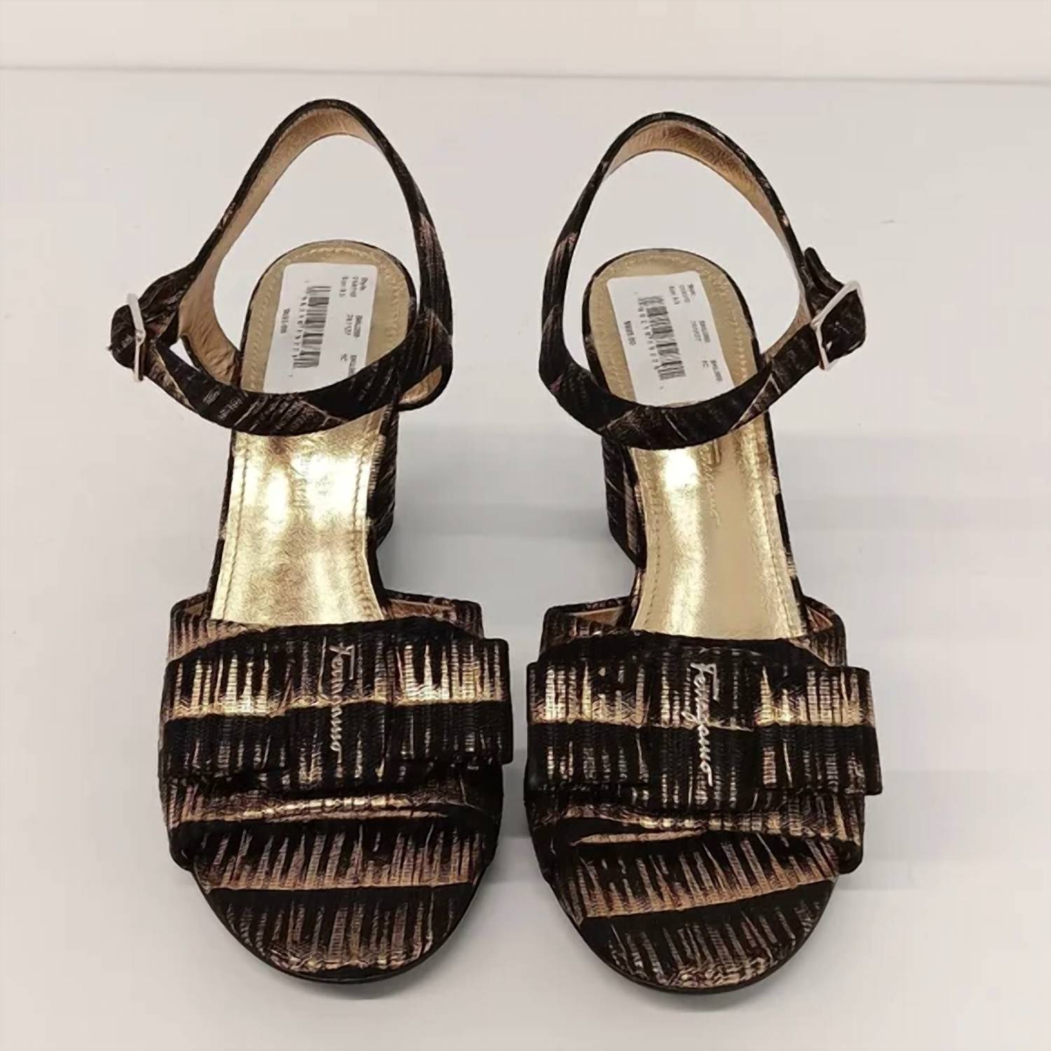 This sandal will take you from brunch to dinner and everything in between. Step into elegance with the Women's Violet Laminated Leather Heeled Sandals by Salvatore Ferragamo, perfect for your next dinner party. These stunning sandals feature a buckling ankle strap, a sophisticated round toeline, and a captivating geometric covered block heel with a height of 3.5 inches. Crafted from luxurious two-tone leather with a laminated effect, they exude a vintage charm. Ideal for summer occasions, these sandals are finished with a leather backing and sole, showcasing the iconic brand logo and a delicate bow detail.