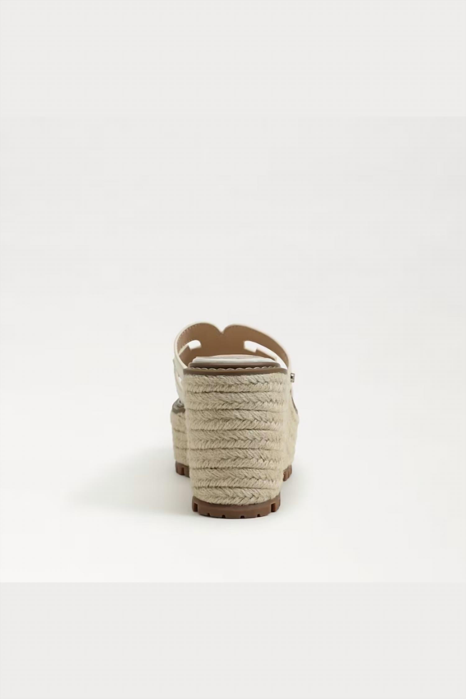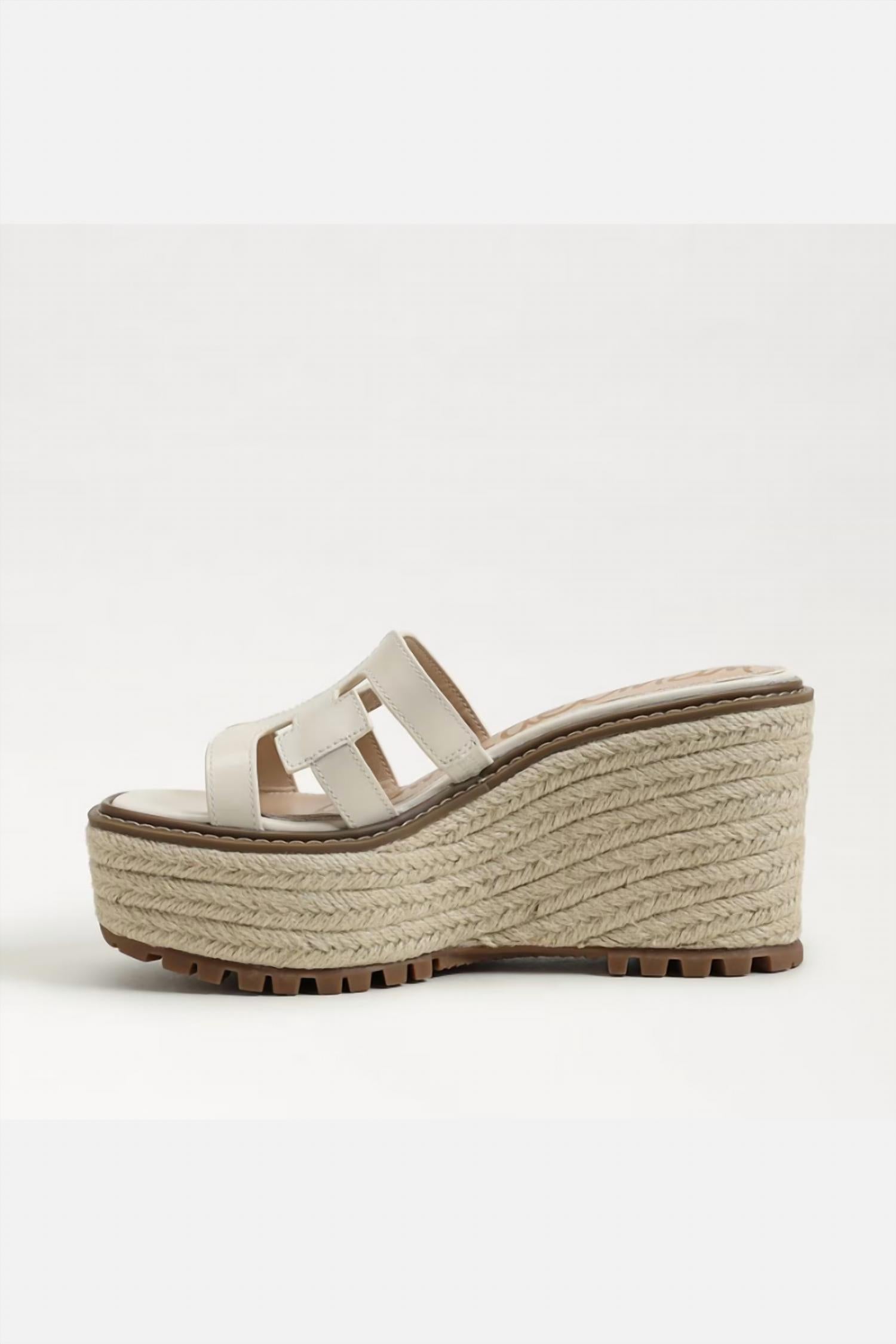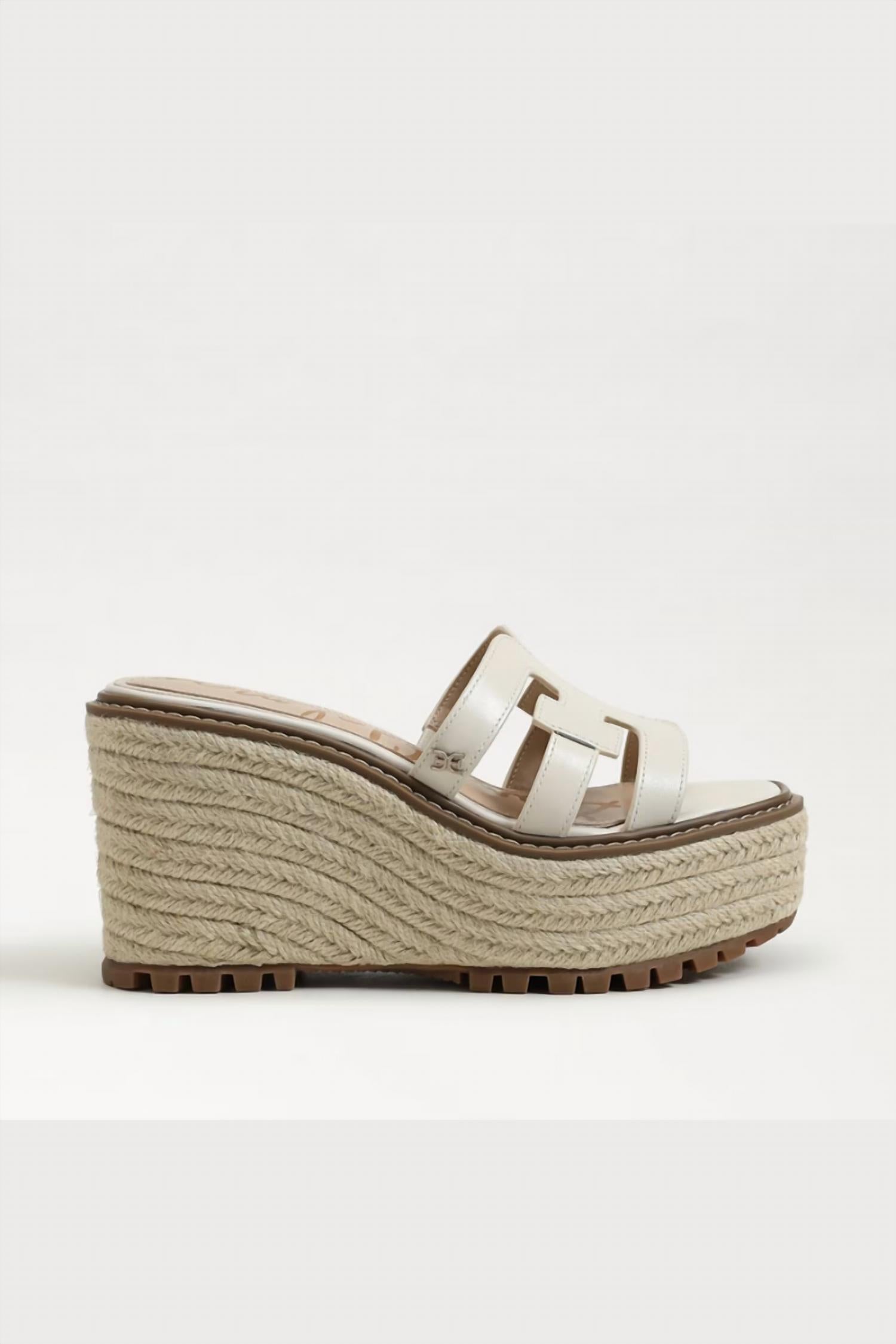 Elevate your footwear game with these adorable wedges. Elevate your summer style with the Laine Platform Wedge Sandal by Sam Edelman, crafted from elegant ivory leather. Featuring a convenient slip-on design and a sophisticated open toe, this sandal is perfect for evening events and 4th of July celebrations. The wedge heel stands at 3.7 inches with a platform height of 3.3 inches, offering both comfort and a subtle boost. With its iconic double E detailing, Laine combines quiet luxury with a trendy appeal ideal for your summer wardrobe.