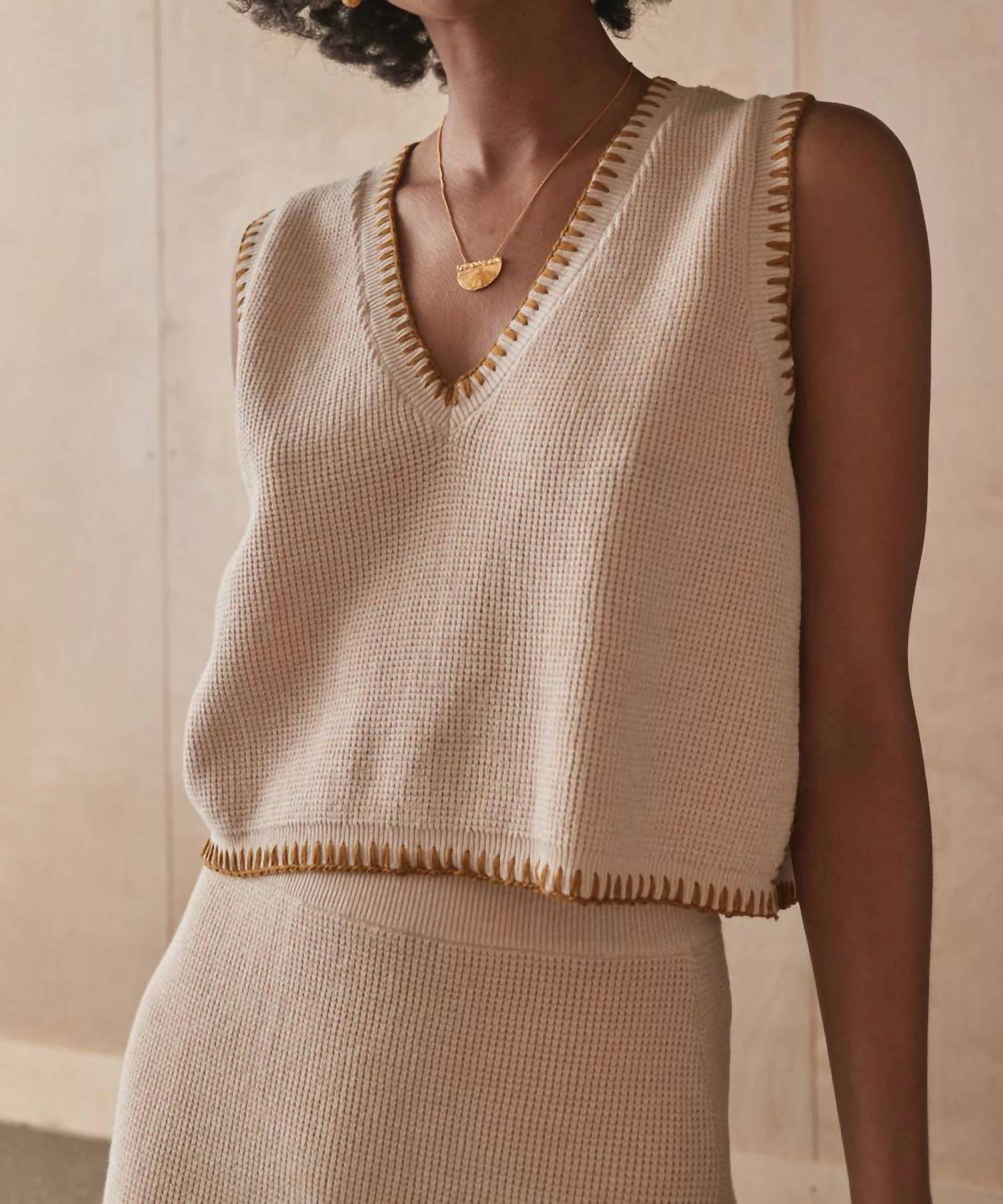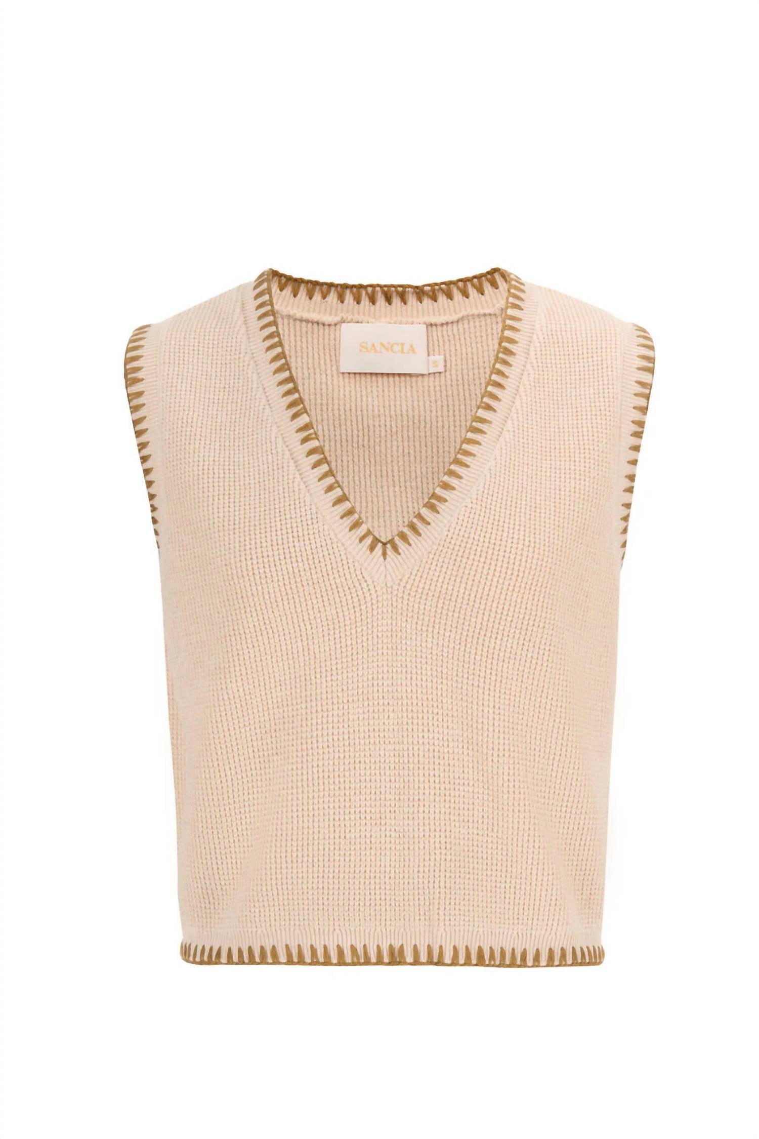 Throw this vest over an all black outfit for a perfectly polished look. Discover the Bronwynne Knit Vest by Sancia, a timeless piece in a cozy Cashew shade crafted for minimalist fashion. This sleeveless, cotton blend vest is composed of 80% cotton and 20% wool, offering both warmth and softness. It features a solid pattern with a versatile V-neckline, ideal for layering or wearing on its own. With a pull-on closure, this vest is designed for easy wear and care instructions recommend hand washing and laying flat to dry, perfect for fall styling.