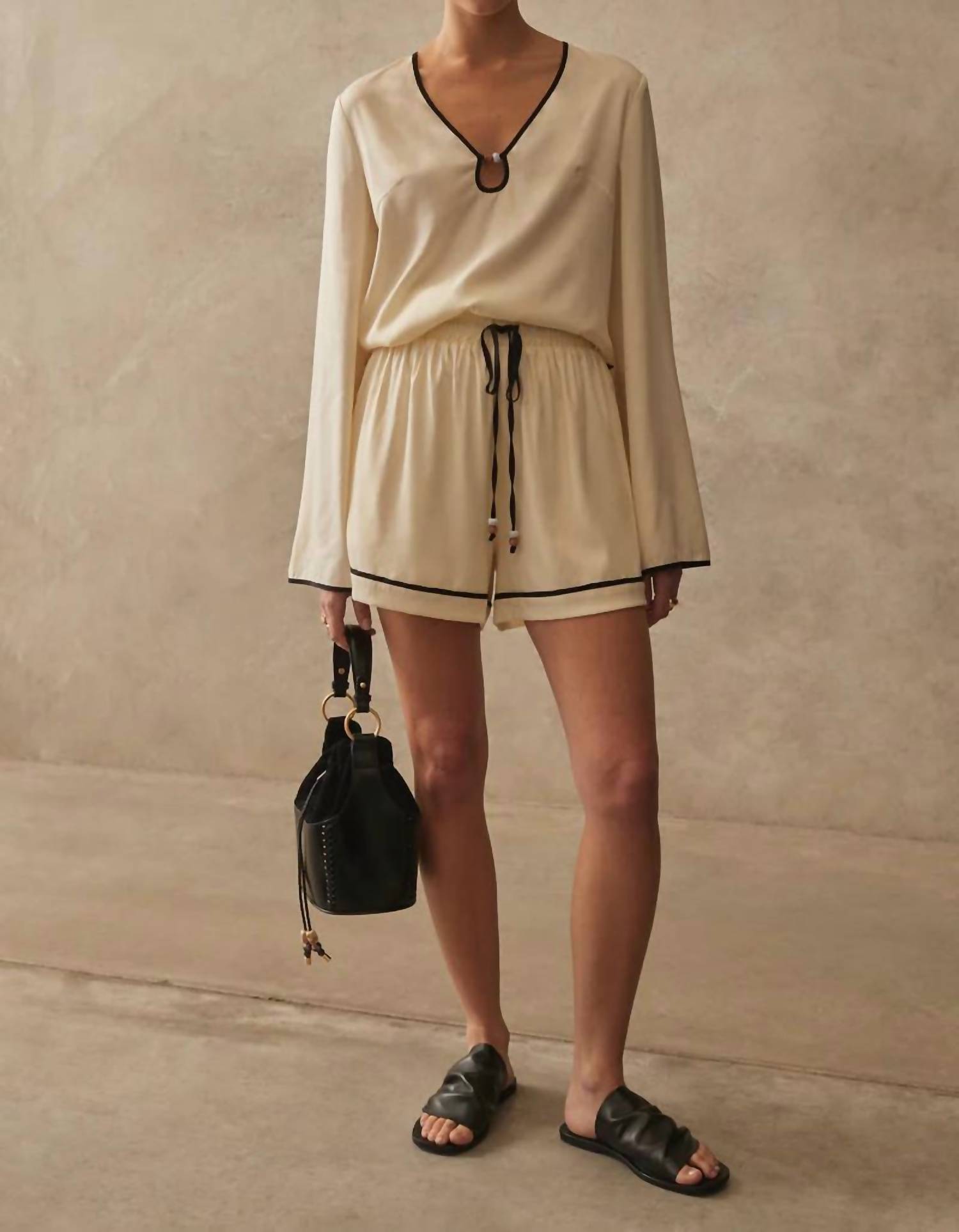 Pair this with your favorite jeans and slides for your next girls night out. Introducing the Lawton Top by Sancia, a timeless addition to your wardrobe that effortlessly blends vintage charm with modern style. This women's blouse in elegant beige features long sleeves and a distinguished V-neckline. Crafted from a luxurious blend of 66% Cupro, 30% Viscose, and 4% Spandex, this piece offers a relaxed, flowy fit perfect for any dinner party. Closure: Pull on. Care: Hand wash and line dry. Model is 5'9" and wears size XS; consider sizing down for a more fitted look.