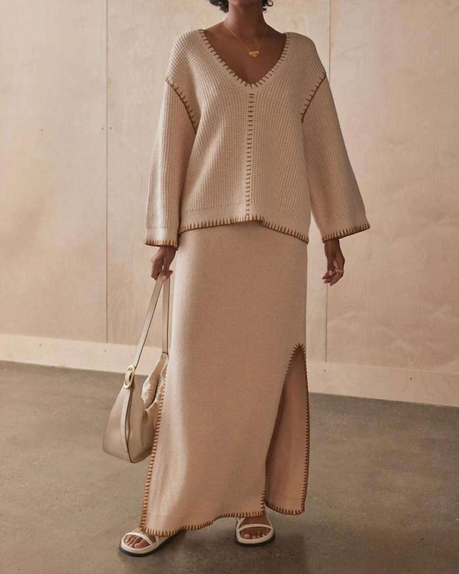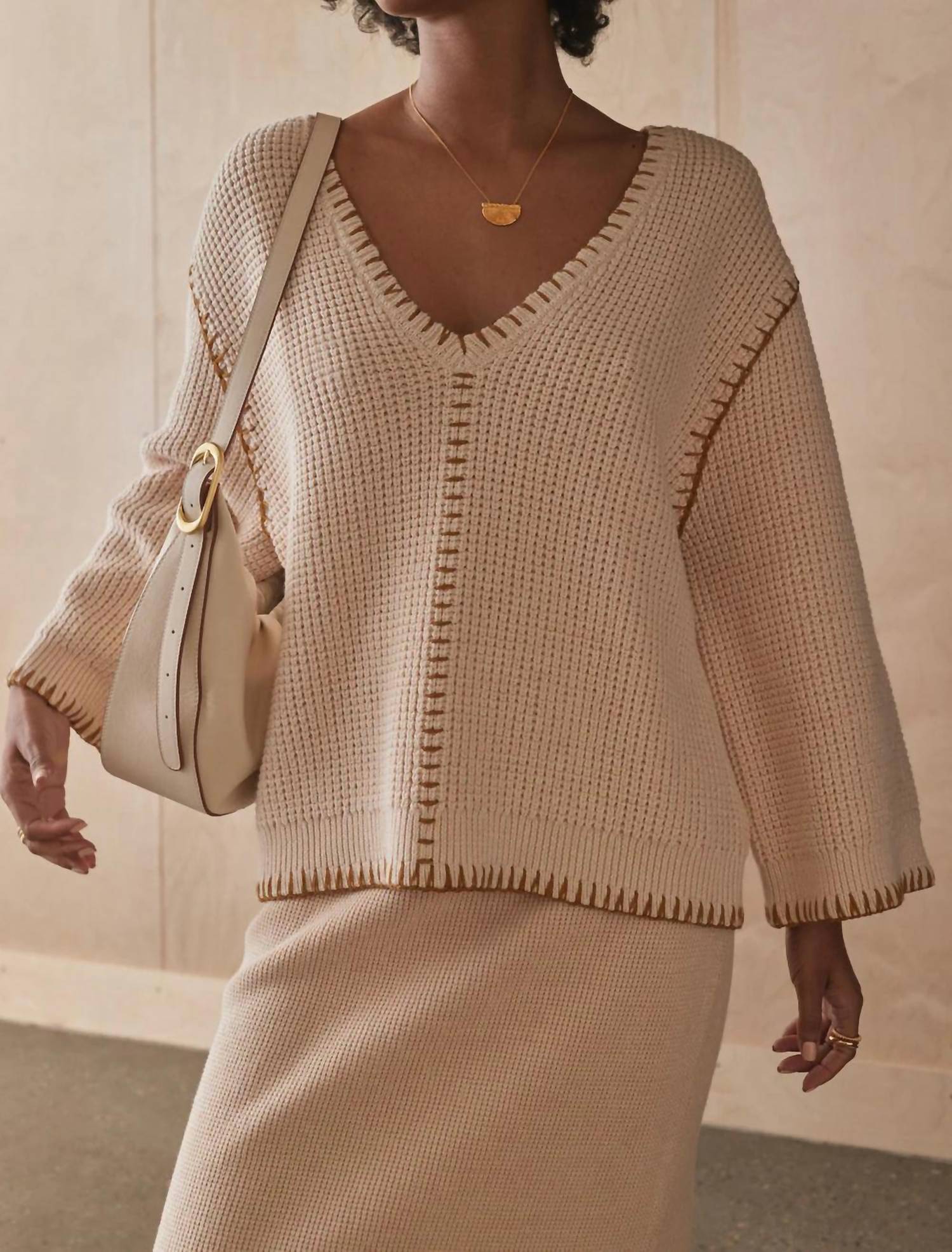 A versatile blouse that works from desk to dinner! Introducing the Rina Knit Jumper by Sancia, a must-have piece in a versatile cashew tone perfect for your fall wardrobe. This jumper features long sleeves and a relaxed fit with a V-neckline, complemented by a distinctive textured pattern and drop shoulders. Crafted from a cozy cotton blend, it’s a pull-on style made without pockets. Care instructions are to hand wash and lay flat to dry, ensuring the longevity of its expert design details.