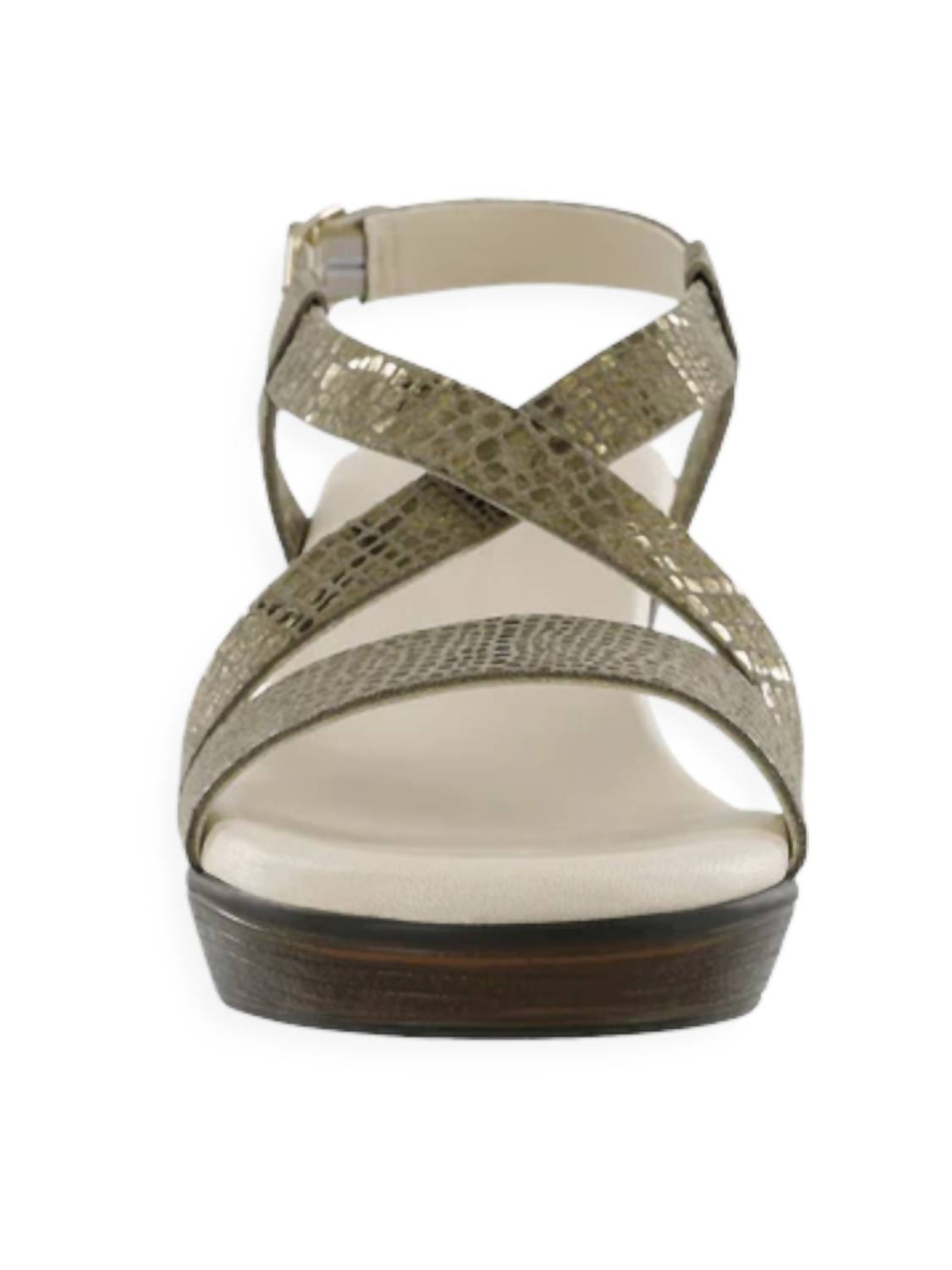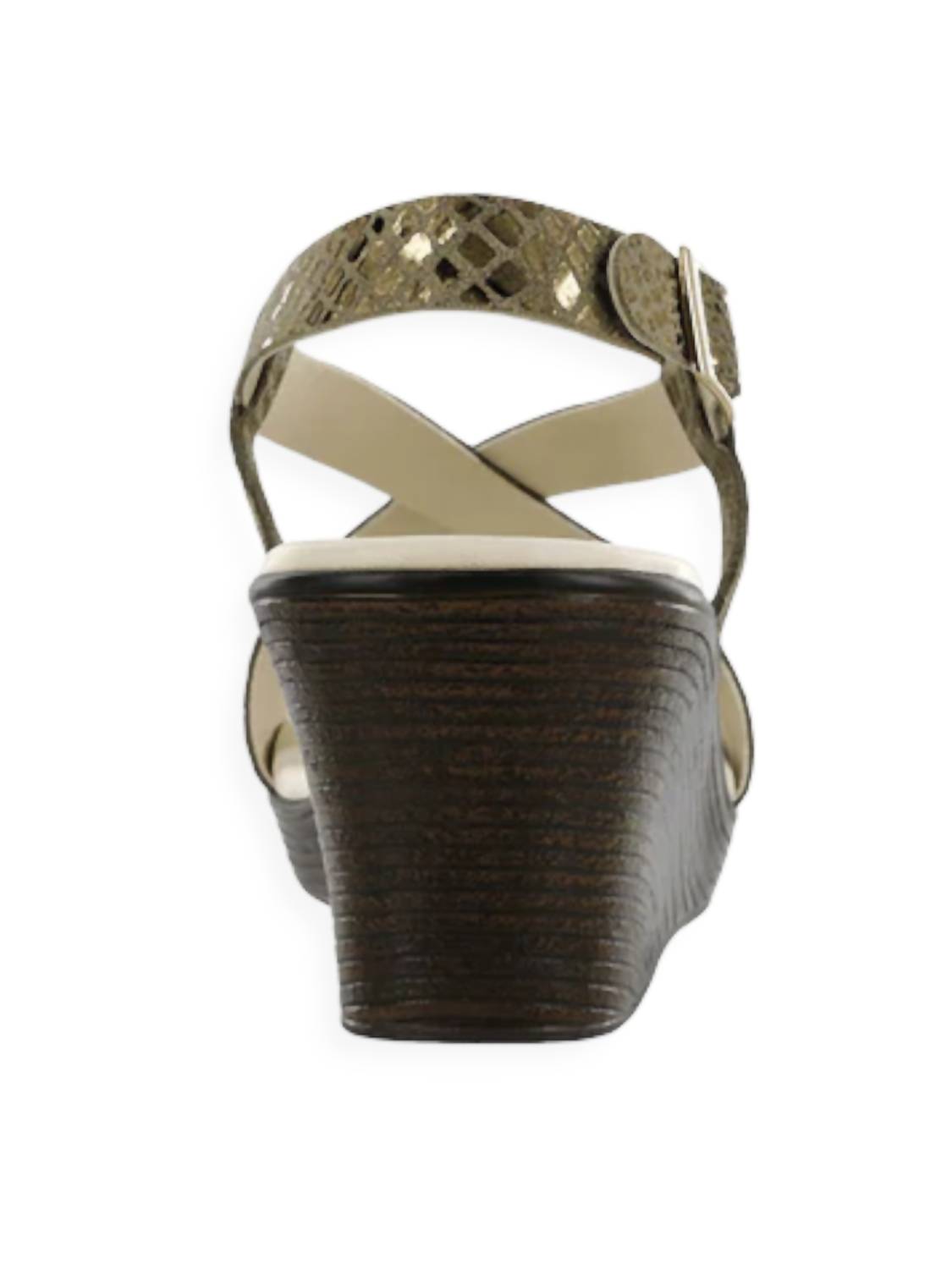 Step into style and comfort with the Women's Delight Wedge Heel Sandals by SAS, crafted from genuine leather in a sophisticated Olive Gold shade. Designed for ultimate support, these sandals feature plush leather-lined crisscross straps and an adjustable ankle strap ensuring a bespoke fit. The wedge heel, with a 2.875" height, showcases a wood grain look and a woven outsole that offers traction and stability. Ideal for both dressy and casual outings, these sandals are an elegant addition to any wardrobe.