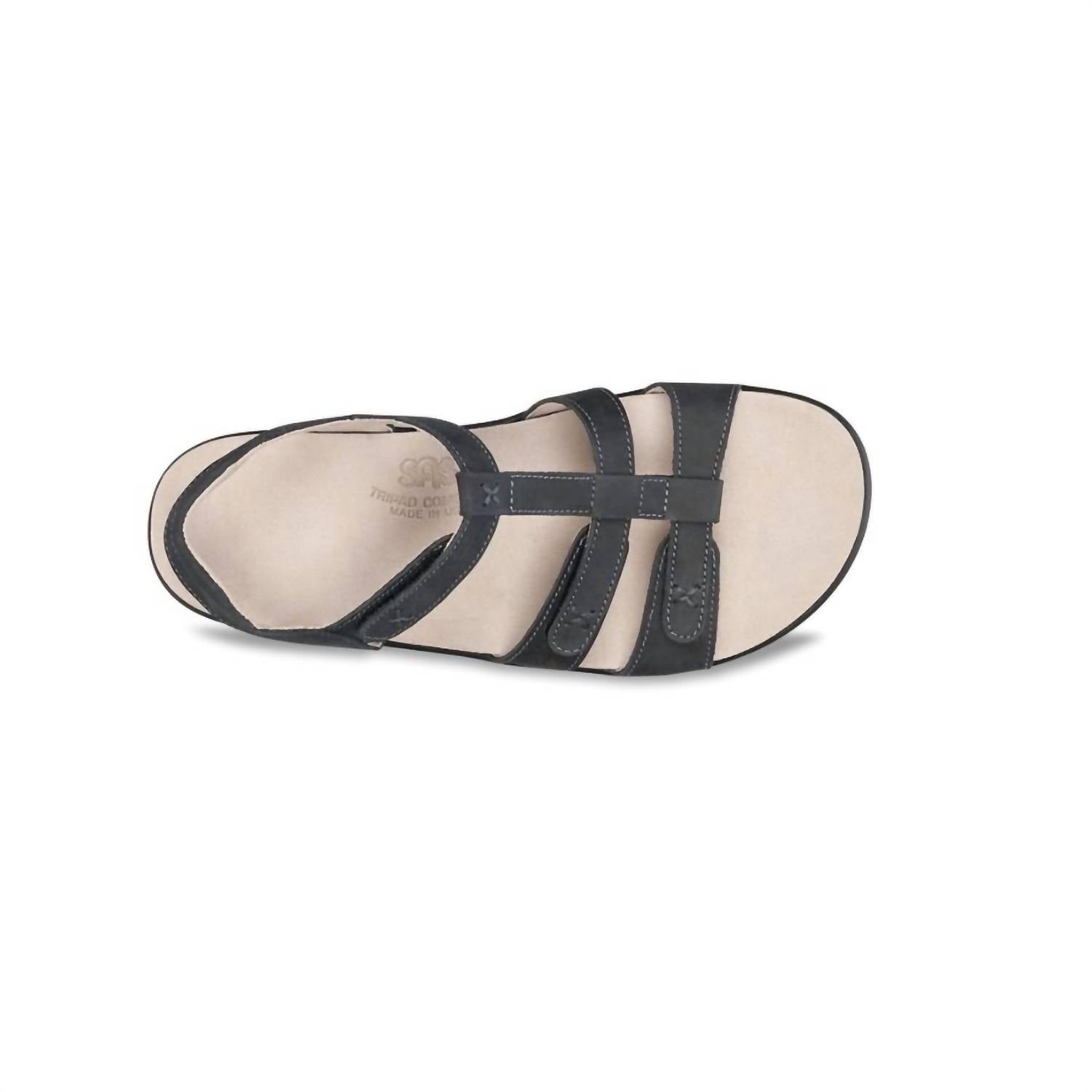 Flowy dresses, cropped pants, and even jumpsuits... this sandal works with them all! Discover the SAS Women Sorrento Adjustable Sandal in Nero, a perfect blend of comfort and style for your summer wardrobe. Made in the USA with genuine smooth and nubuck leather, this minimalist sandal features three adjustable hook-and-loop strap closures for a customizable fit. The cushioned, contoured footbed is covered in soft Super Suede, designed to support the natural arch, while a synthetic sole ensures a soft rebound with each step. Embrace effortless style with this round-toe, slip-on sandal, ideal for vacations or casual outings, and enjoy its low heel height of 1 1/4"-2".