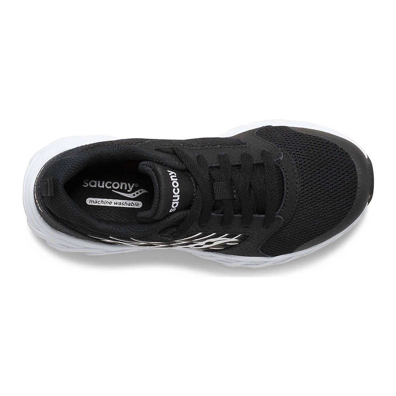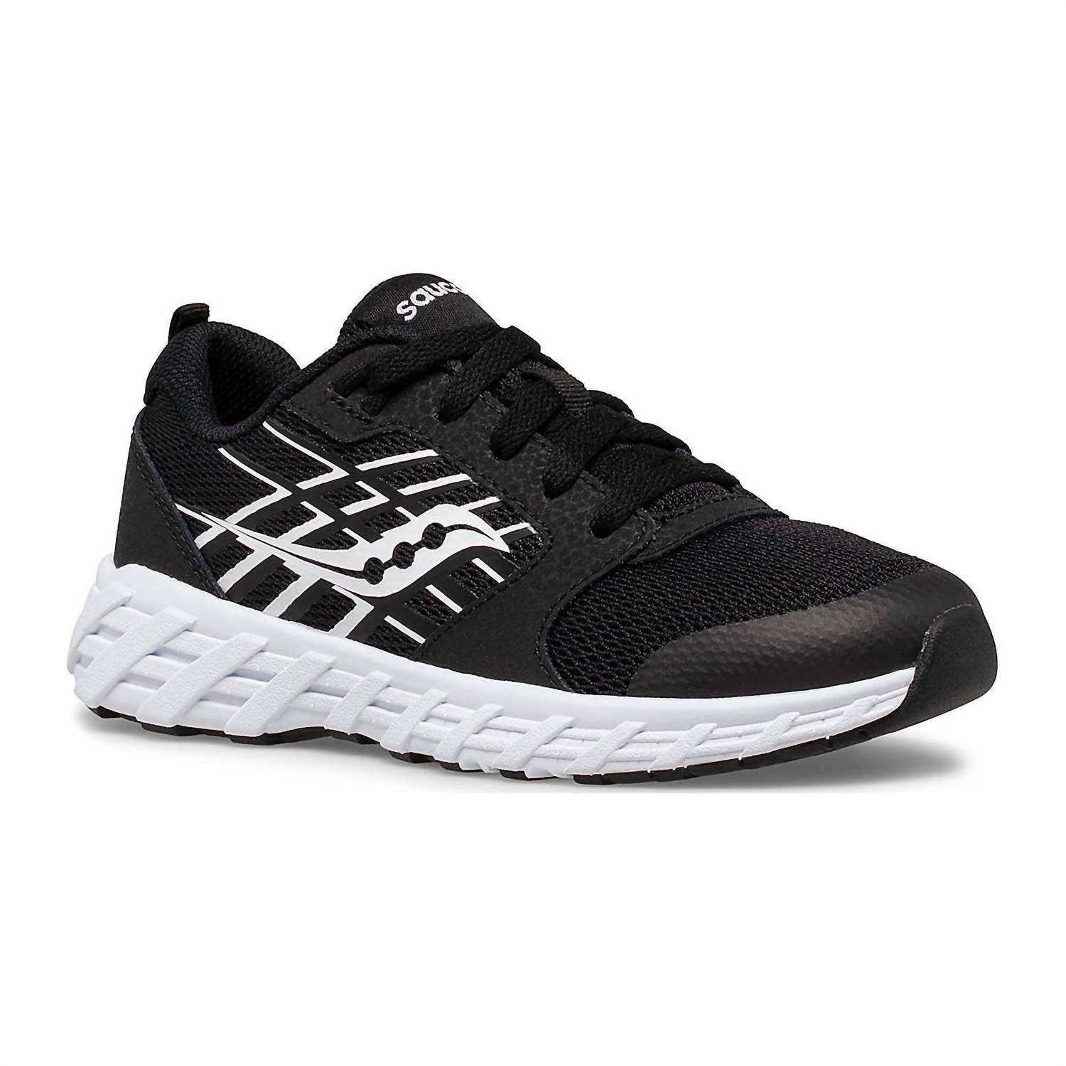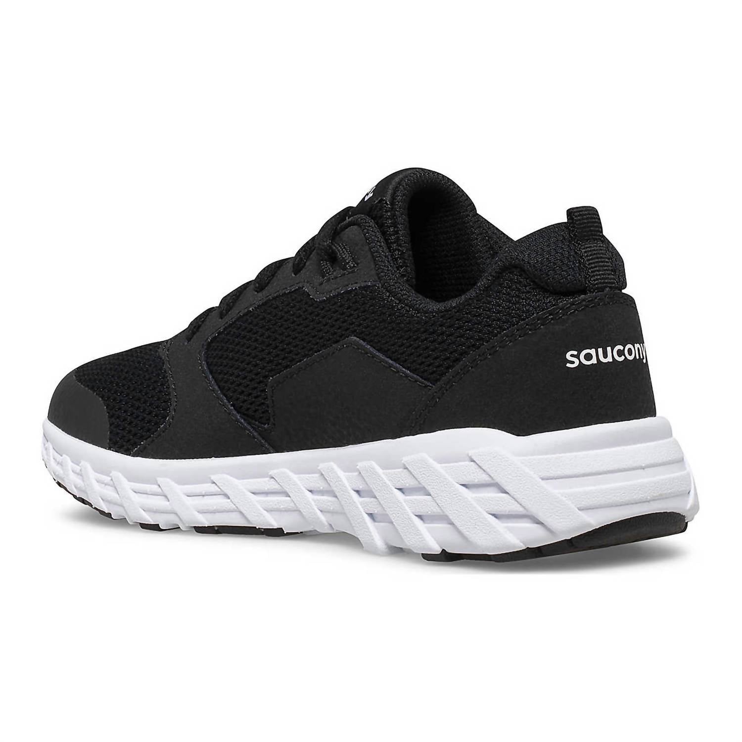 Introducing the Boys Wind 2.0 Lace Sneaker by Saucony, a fresh take on a beloved classic designed for Big Kids who value comfort and style. The sneaker features breathable mesh and durable leather in sleek black, with a lightweight EVA midsole and a non-marking rubber outsole for improved comfort and traction. It boasts a traditional lace closure and an anti-stink lining for freshness, with recycled PET linings adding an eco-friendly touch. Care is simple thanks to its machine washable design; just wash with cold water on a gentle cycle and air dry.
