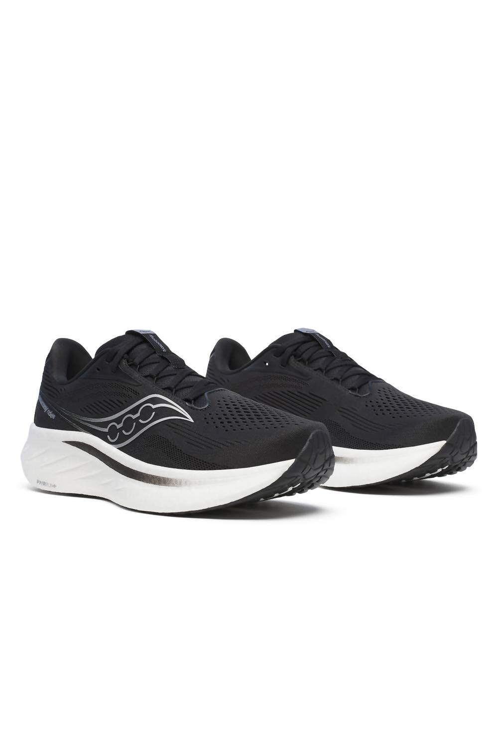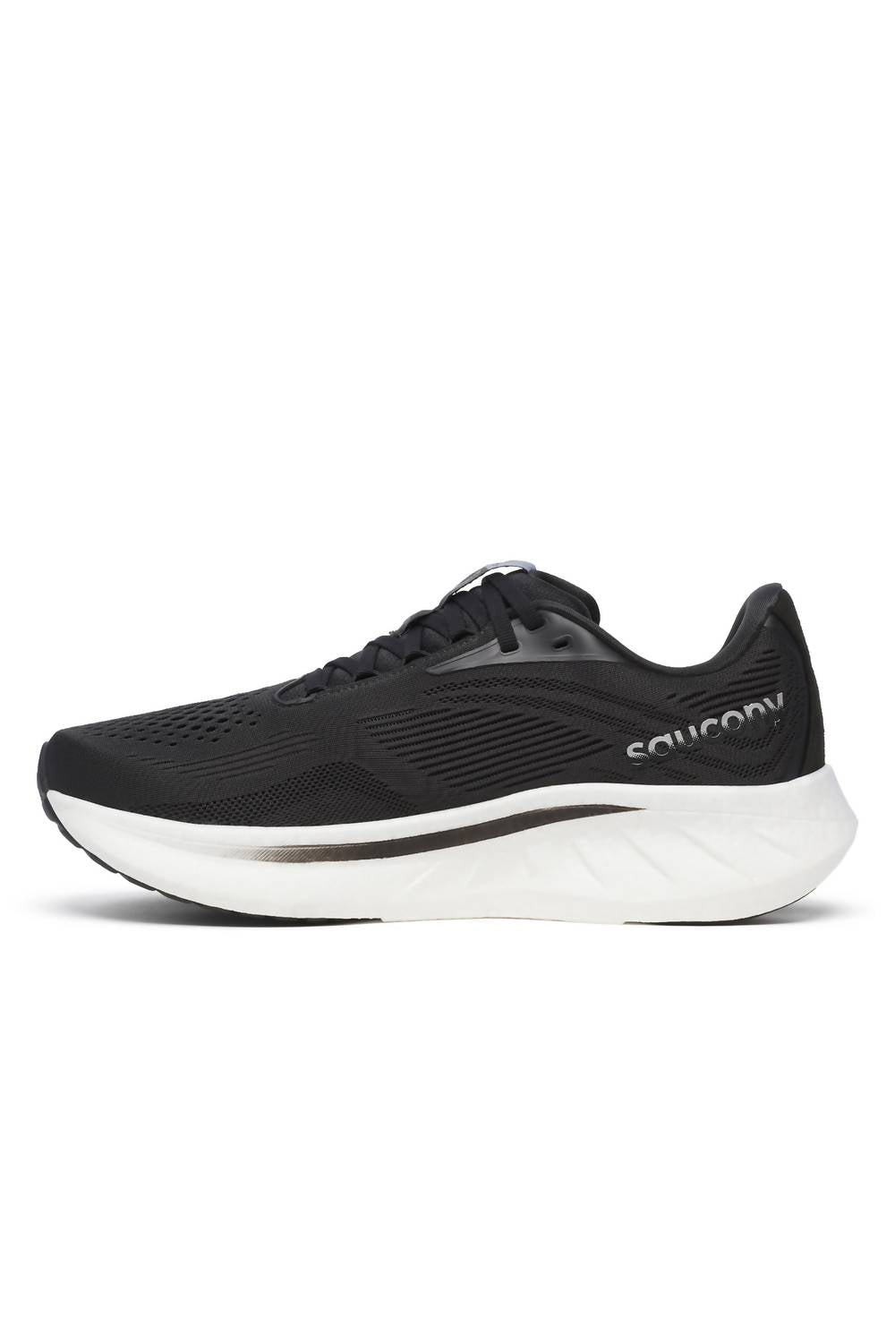 When fashion meets function. Introducing the SAUCONY Men's Ride 18 Shoes, expertly crafted with a focus on comfort and adaptability. This sneaker features a breathable and stretchable engineered mesh upper with added heel collar cushioning, ensuring a snug fit for every stride. The black/skydiver colorway adds a sleek touch, complemented by the round toe and flat heel design. Perfect for spring and versatile enough for any occasion, these sneakers bring minimalistic style and superior performance to your run or casual dinner party.