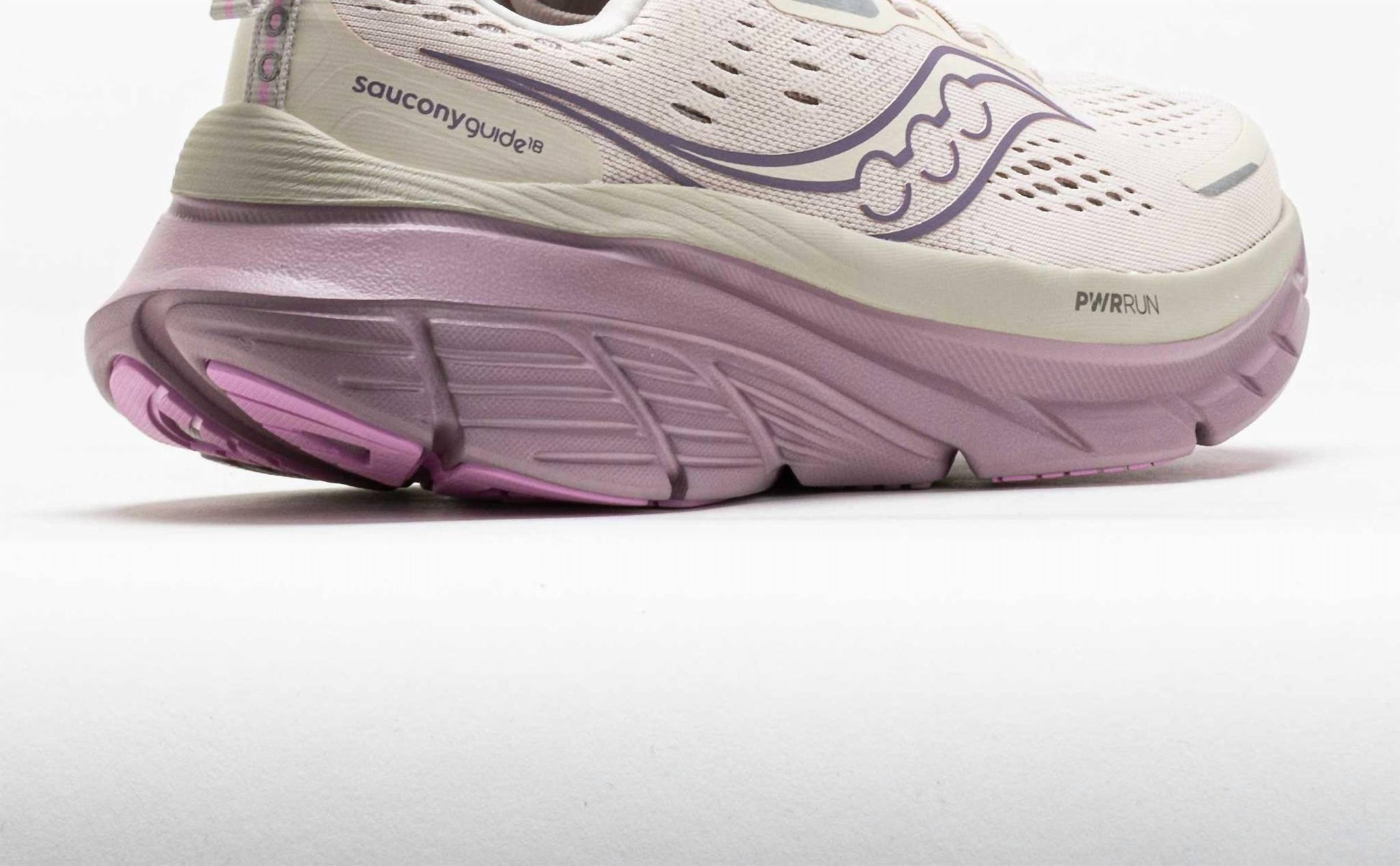 When fashion and function come together seamlessly. Introducing the Women's Guide 18 Shoes by Saucony, where comfort meets innovation for your fitness and workout needs. Crafted with enhanced PWRRUN cushioning and advanced CenterPath technology, these sneakers provide exceptional protection and security with every step. The redesigned upper features breathable mesh for improved airflow, paired with a padded heel collar for a snug fit. Available in a striking navy and orchid color combination, these sneakers are perfect for spring athleisure with a round toe and flat heel style.