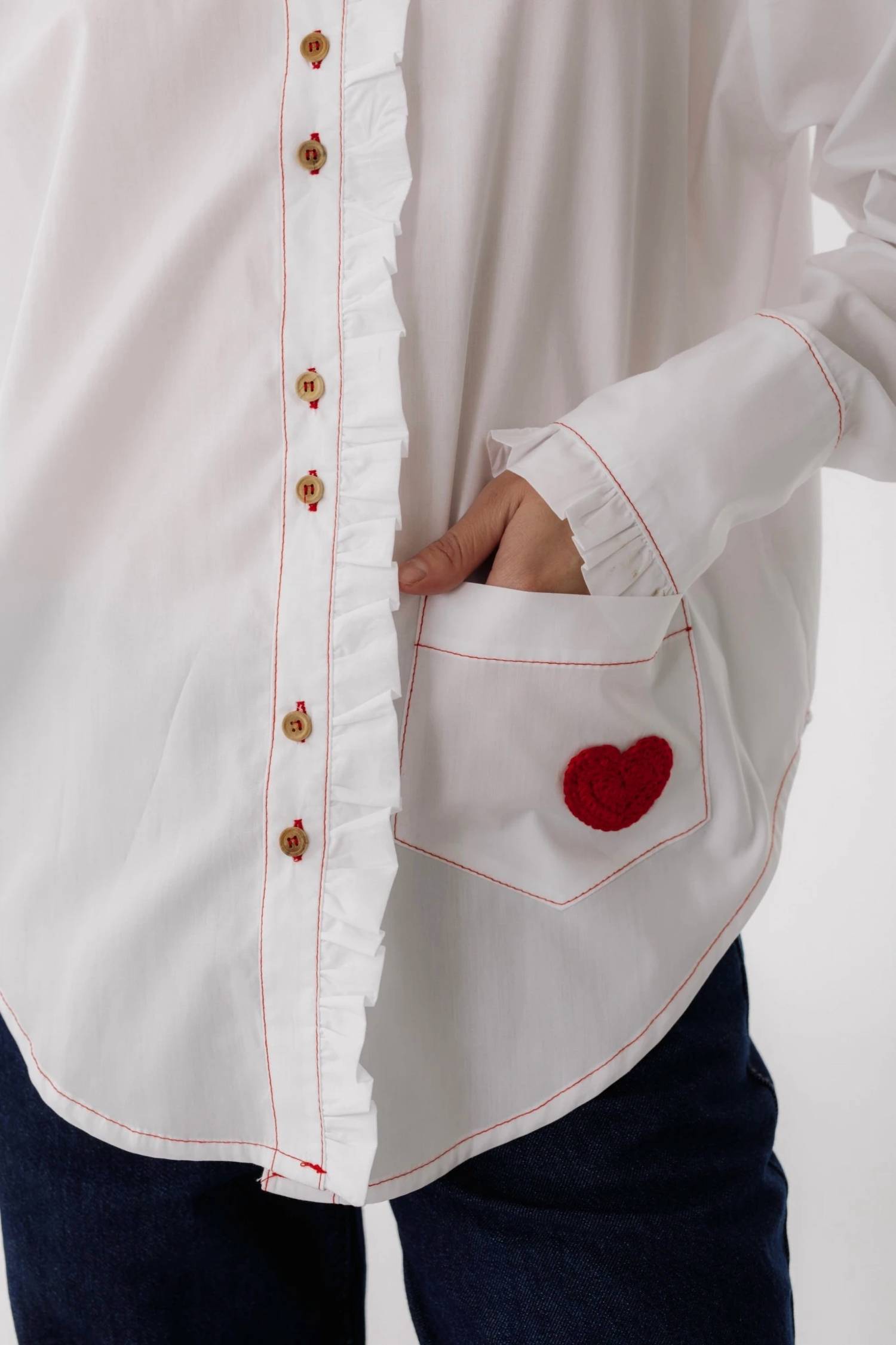 This button down shirt is comfortable yet polished. Introducing the Rafe Button-down Shirt by Savia, a standout piece with its white hue accentuated by contrast red trim and embroidered crochet hearts. This shirt features long sleeves and a high neck, made from quality cotton poplin for a relaxed yet stylish silhouette. Closure: Button closure. Perfect for an elegant minimalistic look this spring.