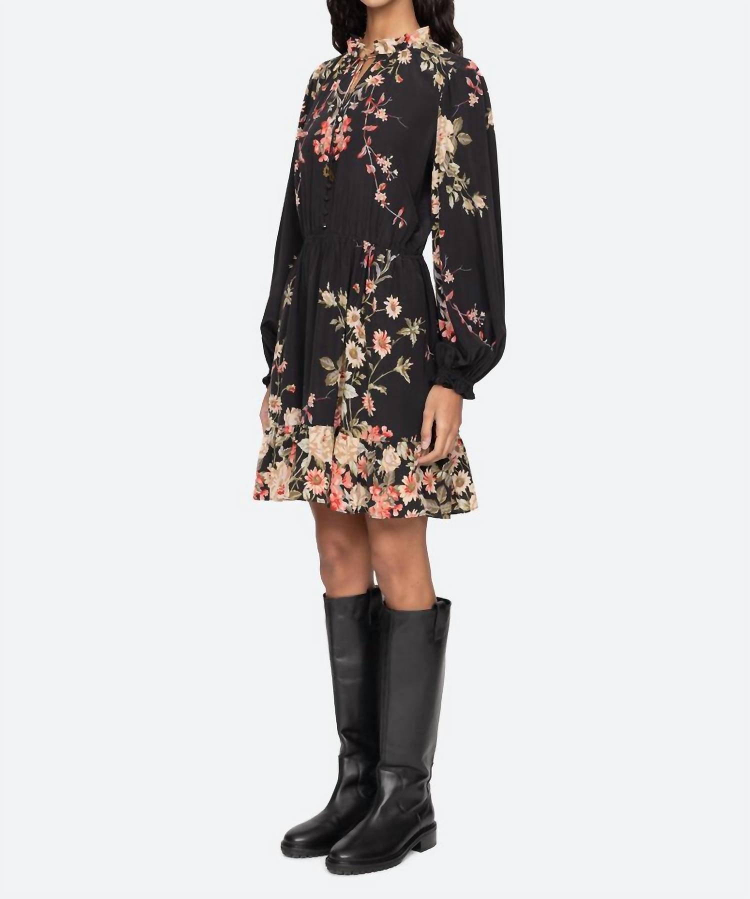 The perfect mini dress for those warmer months. Discover the Jolie Mini Dress by SEA, a multi-colored floral print piece perfect for a boho-chic aesthetic. This elegant dress showcases long puff sleeves, crafted from a blend of 65% viscose and 35% silk, with a 100% viscose lining for added comfort. It features a collar neckline and a button closure, with a vintage-inspired silhouette accented by tassel charms. Ideal for a dinner party or fall outing, the dress offers a blend of romantic elegance and modern style. Model is 5'10" and wearing a size S.
