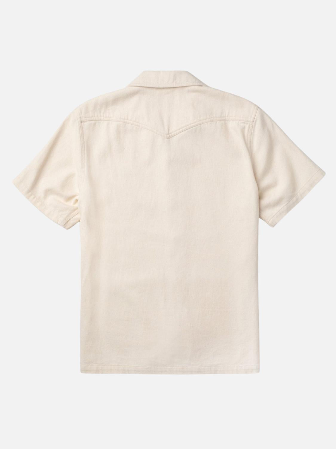 Meet the Southpaw Whippersnapper Top by Seager Co., a minimalist men's casual button-down shirt perfect for your next adventure. Crafted from 100% cotton twill in a natural color, this short sleeve garment features a classic camp collar with a pearl snap closure for an effortlessly laid-back style. The shirt's design includes tonal Seager embroidery and two patch pockets for practicality, while its slightly oversized fit offers comfortable movement. Ideal for vacation or everyday wear, the Southpaw combines durability with relaxed confidence. Model is 6'2" and wearing a size L, with a recommendation to size down for a more tailored fit.